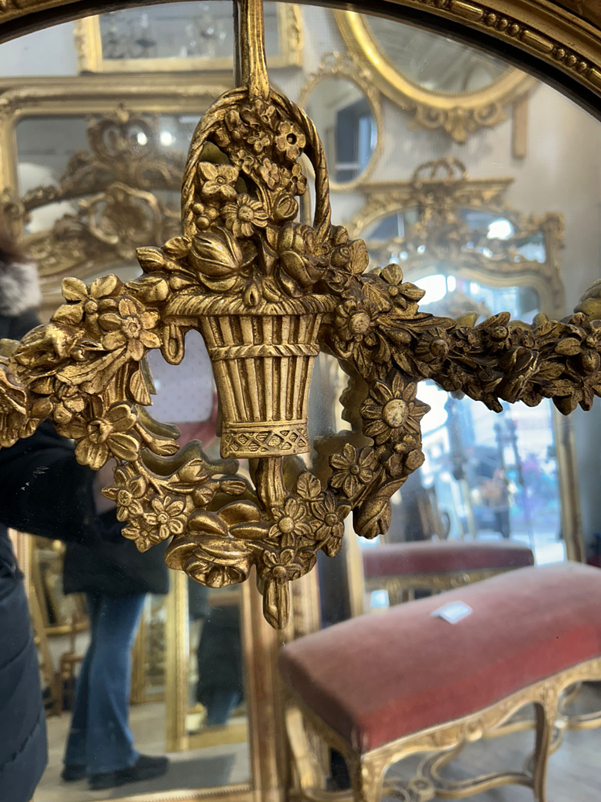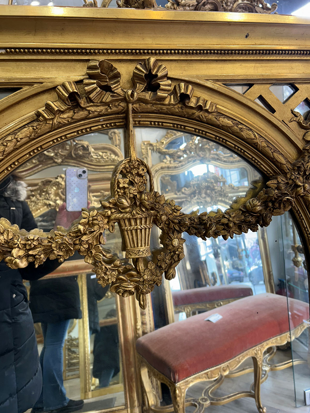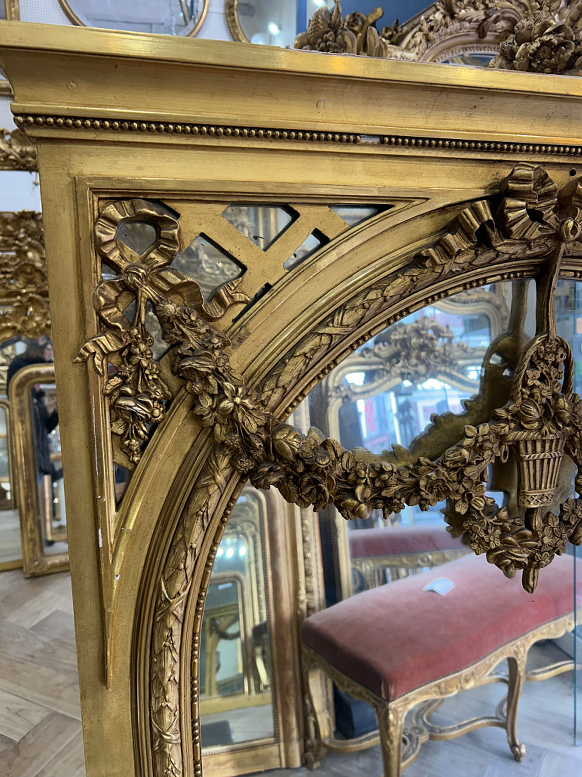 En bois, stuc et feuille d’or. Lignes droites et élégantes, décor raffiné orné de guirlandes de fleurs nœuds.