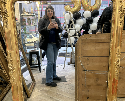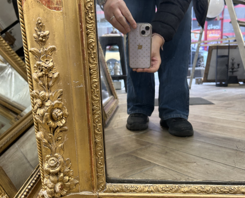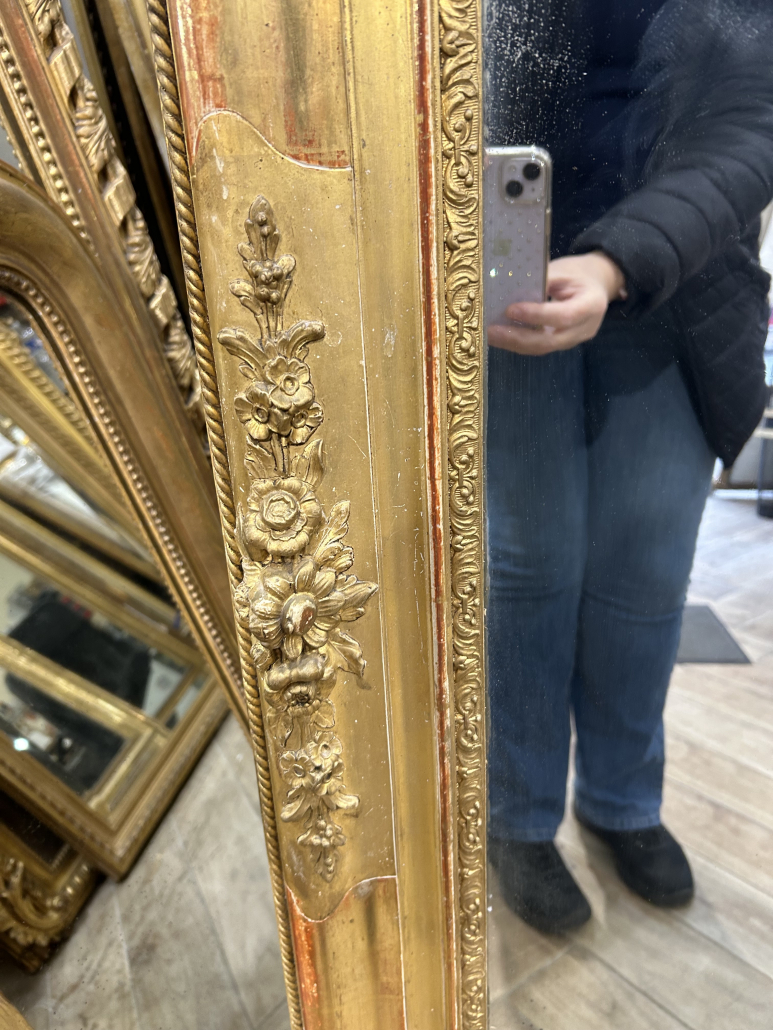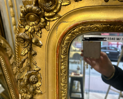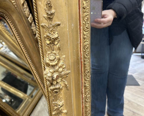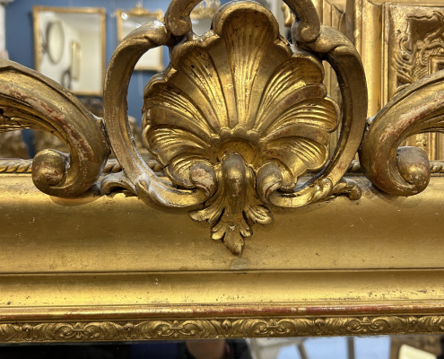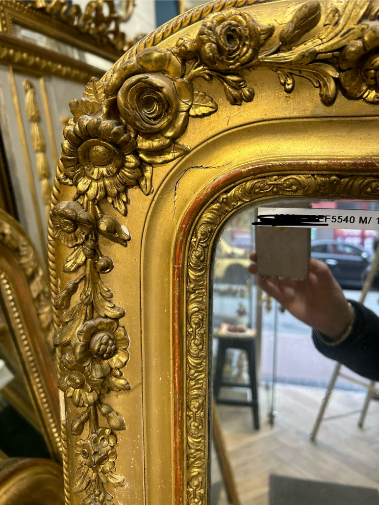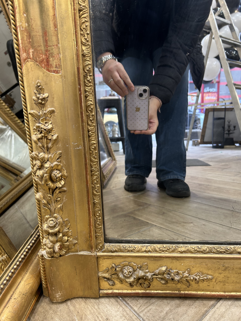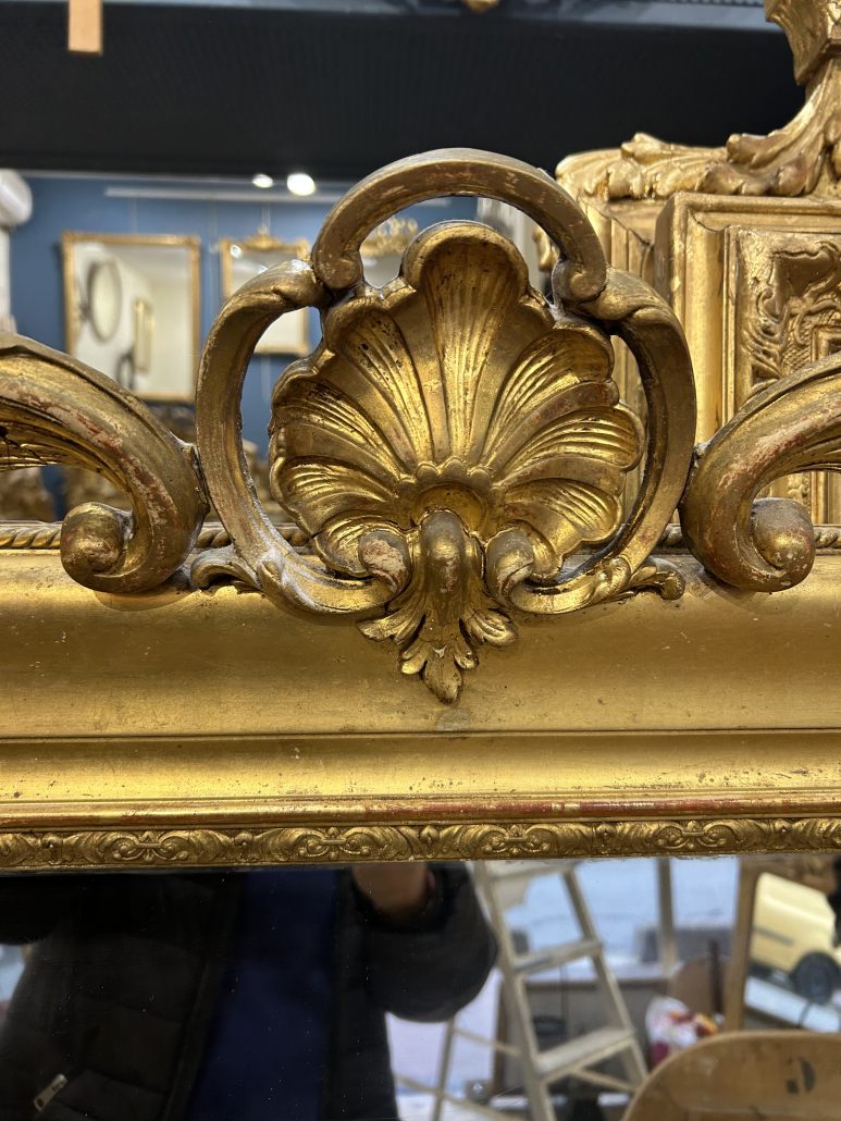 Miroir d’époque restauration de cheminée (environ 1830), en bois stuc et feuille d’or, Fronton Louis XV coquillage,grosses fleurs. Glace au mercure ancienne.