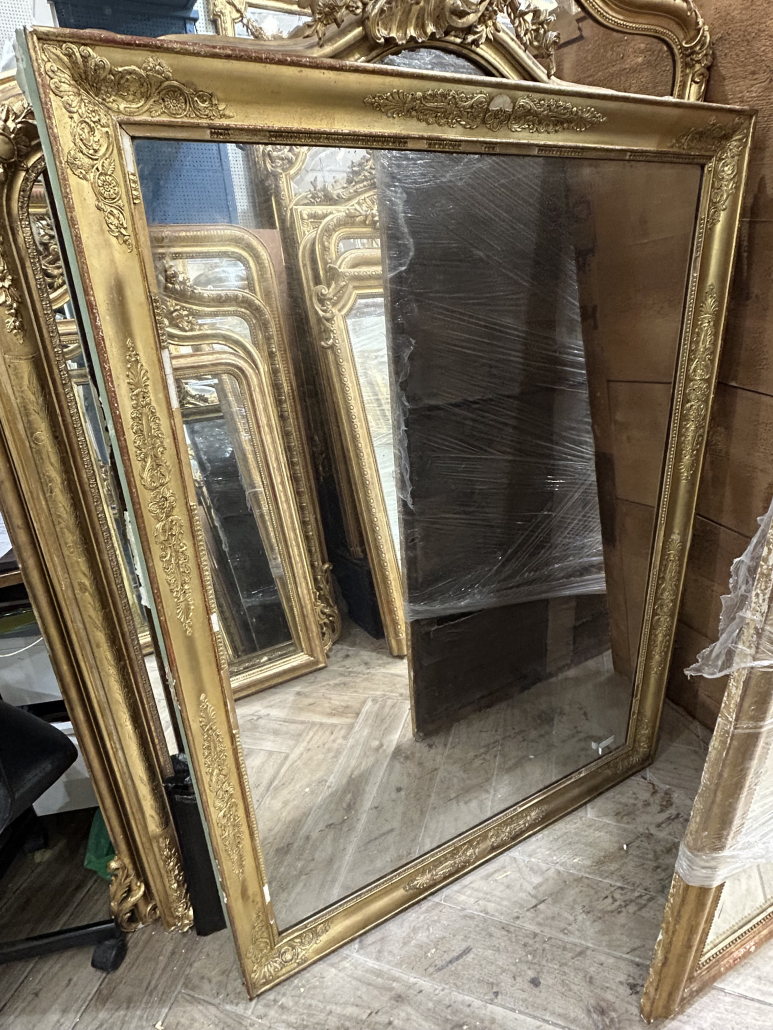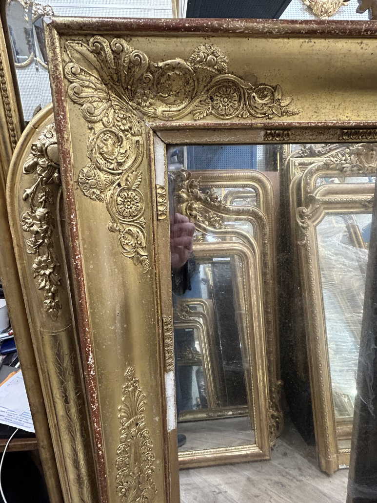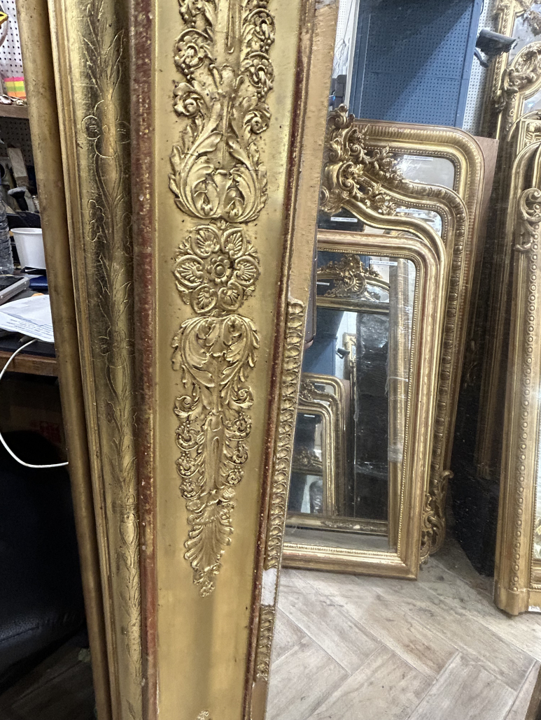 Miroir d’époque Empire vers 1815, cadre en bois doré orné de palmettes, glace au mercure. Le cadre sera reparé