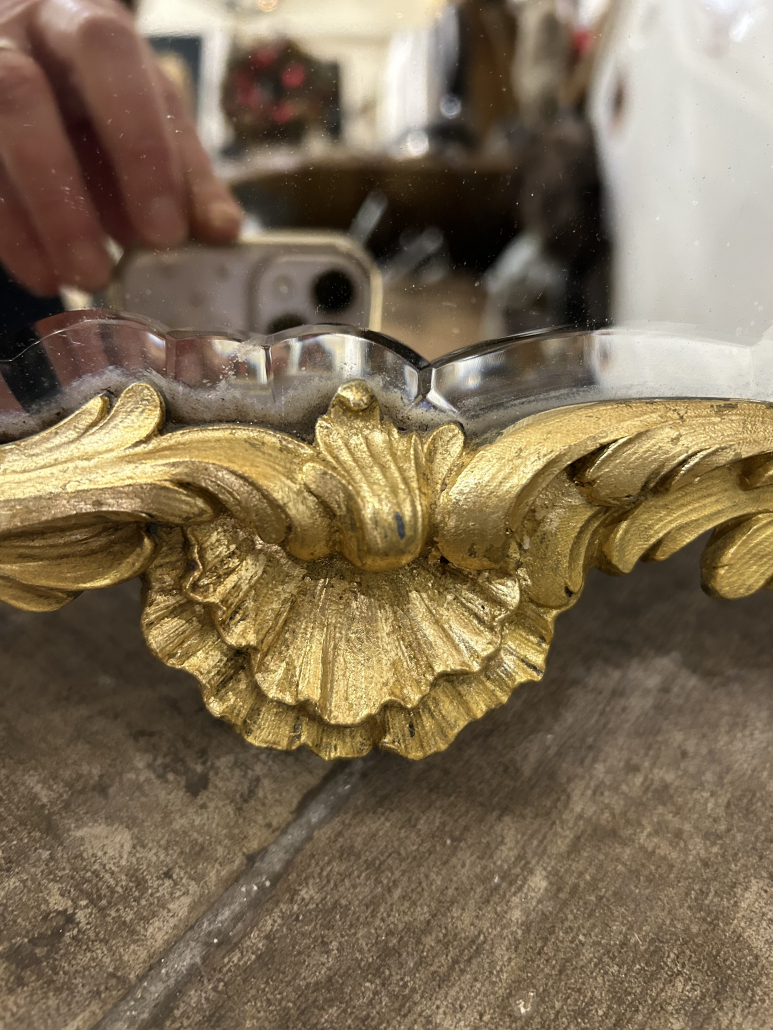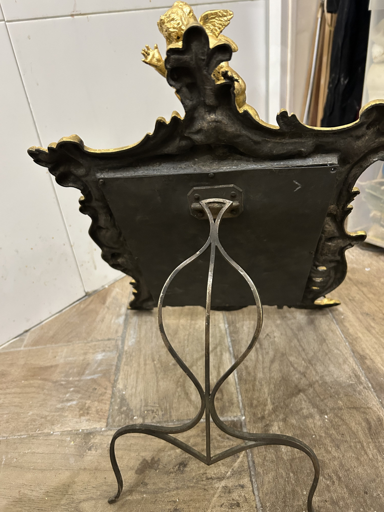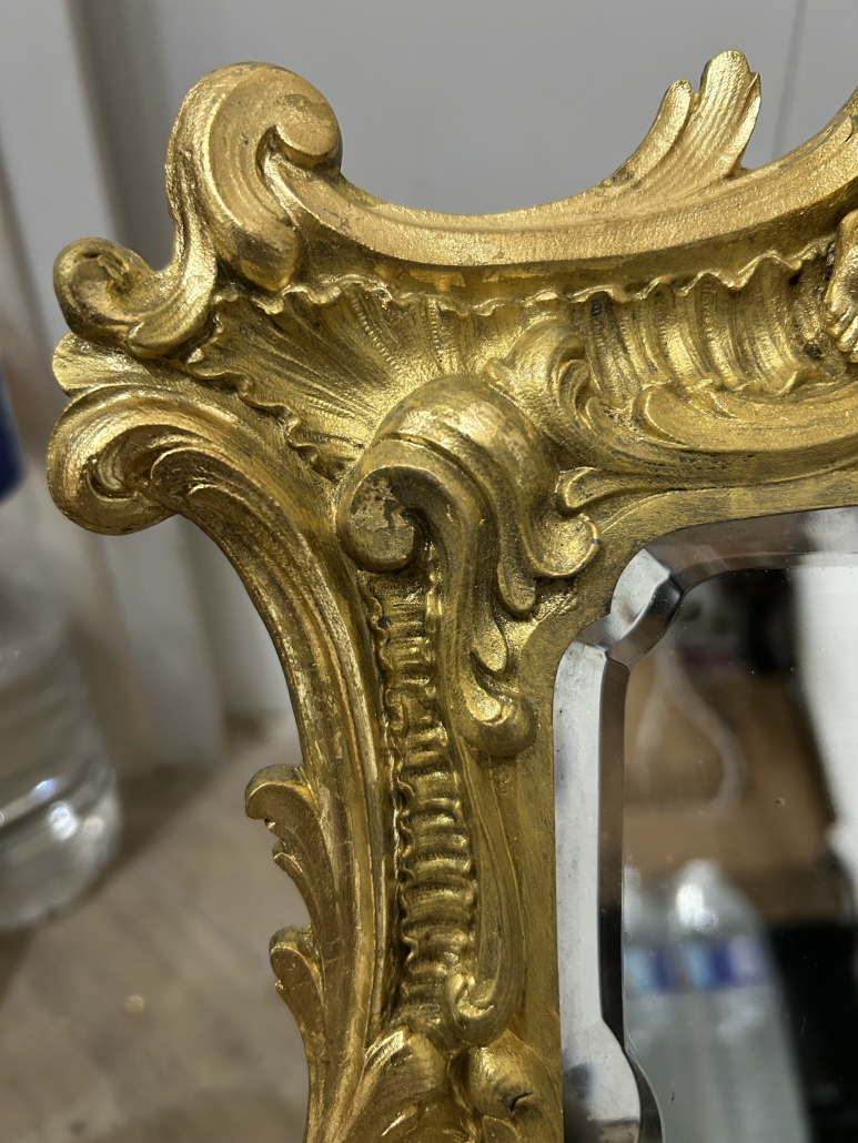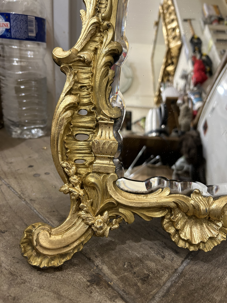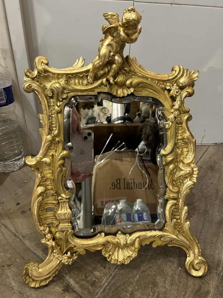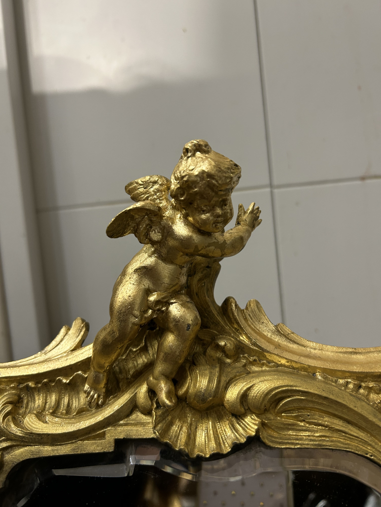 Miroir d’époque Napoléon III de style Louis XV (environ 1880) . en bronze doré ange au fronton. Glace tain biseauté l’argent ancienne.
