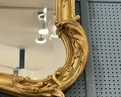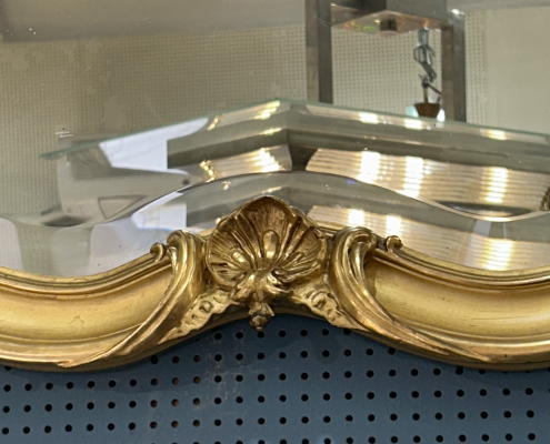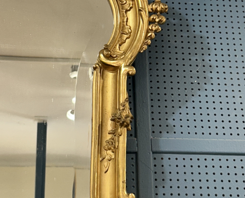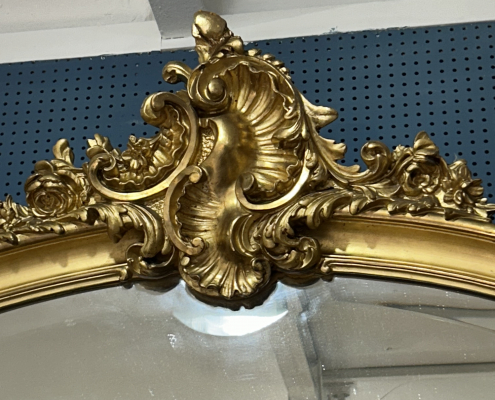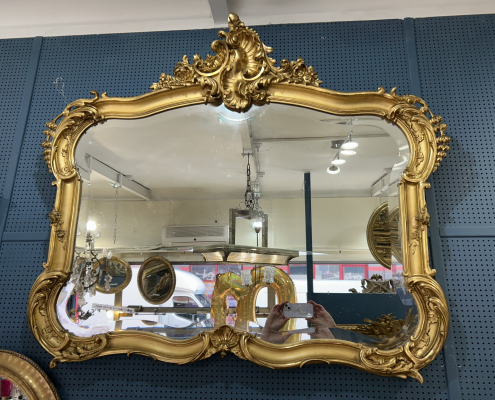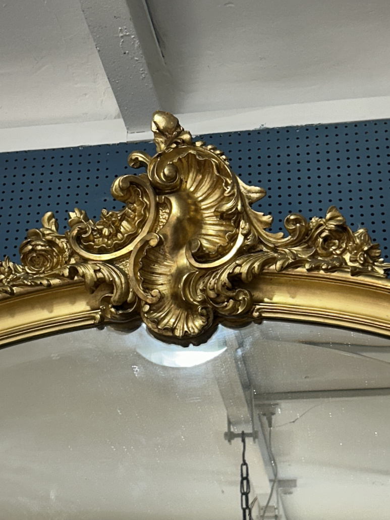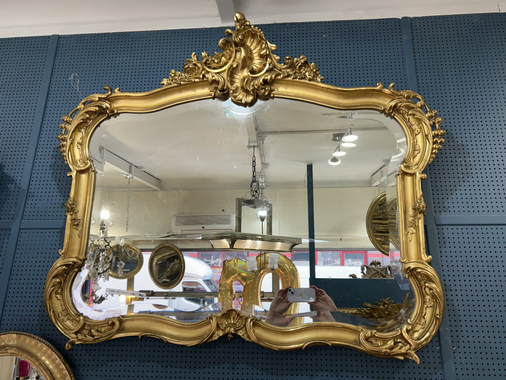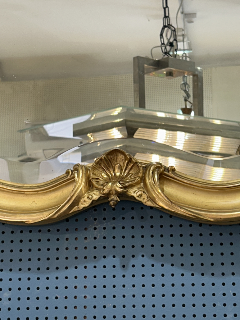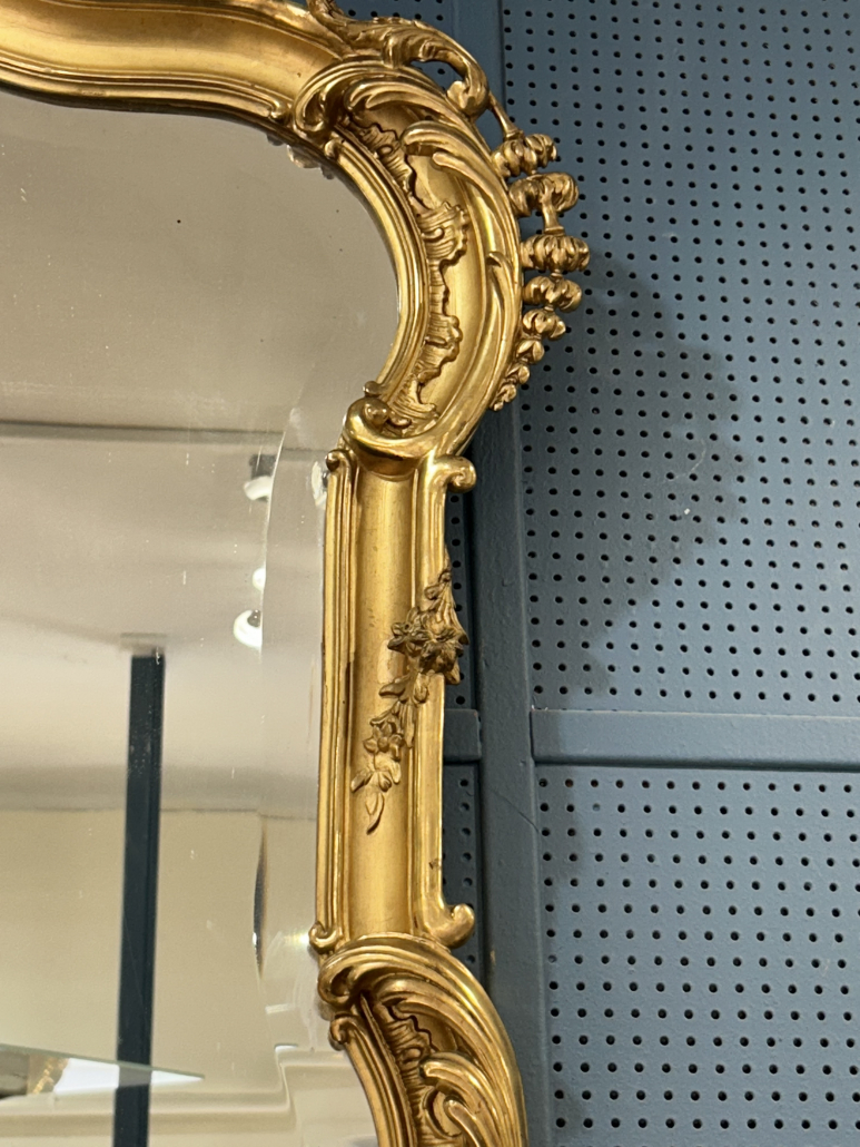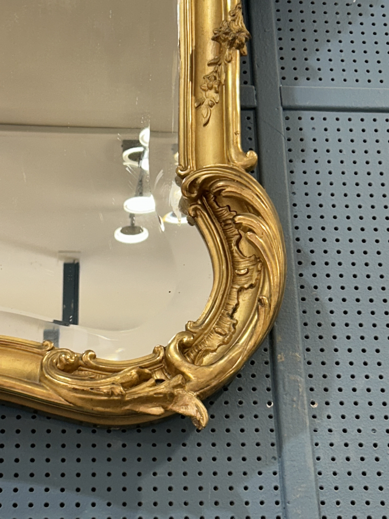 Miroir d’époque Napoléon III de style Louis XV (environ 1880) en largeur . en bois stuc et feuille d’or. Fronton ajouré et perles. Glace biseautée tain à l’argent ancienne.
