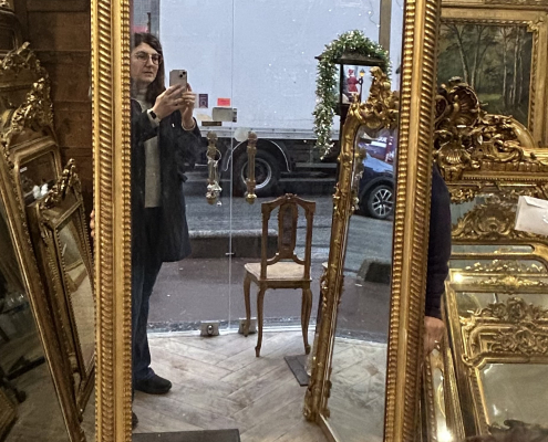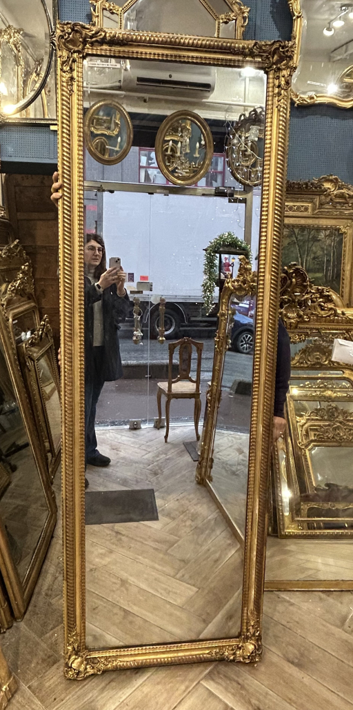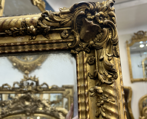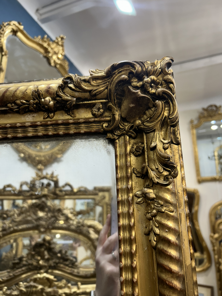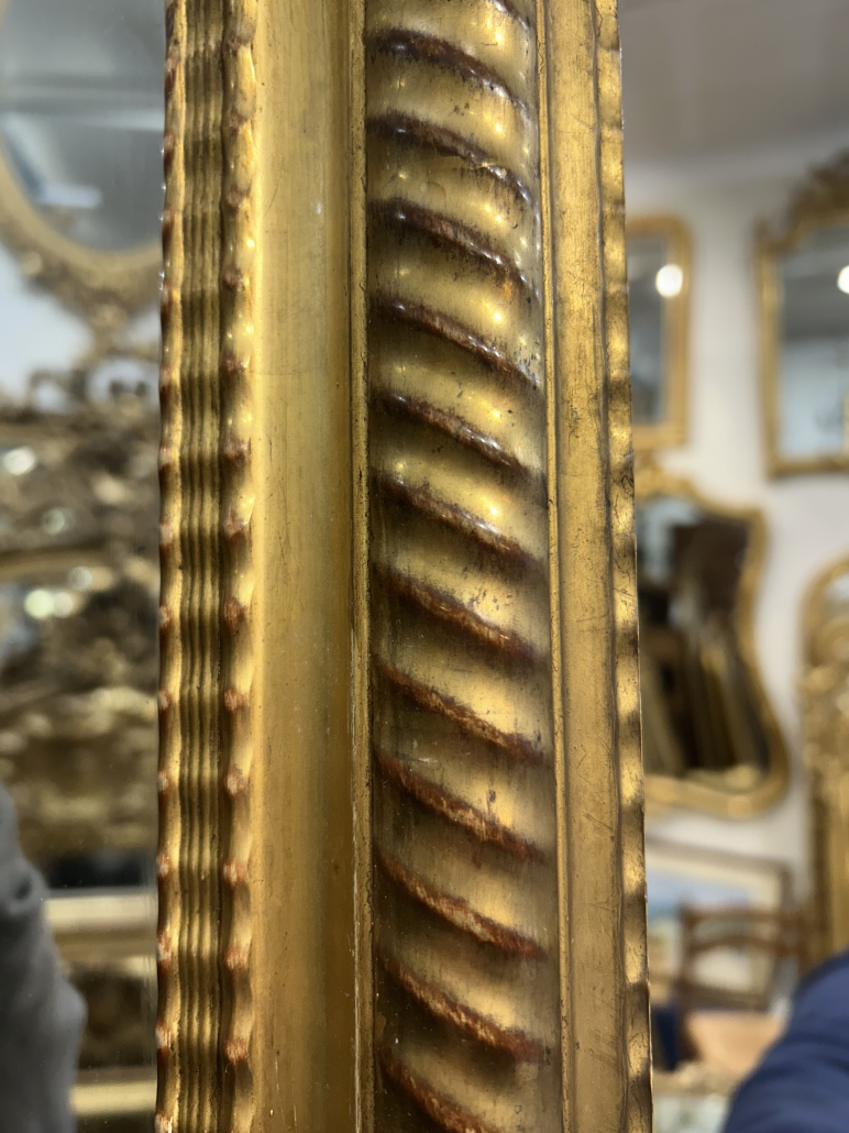 Miroir “d’entre deux “d’époque Restauration (environ 1850), en bois stuc et feuille d’or. Glace au mercure ancienne.