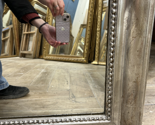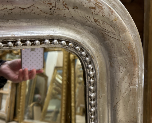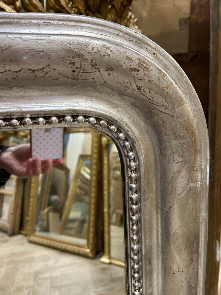 Miroir d’époque Louis-Philippe (environ 1850), en bois stuc et feuille d’argent, gravée de fleurs et perles. Glace à l’argent ancienne.