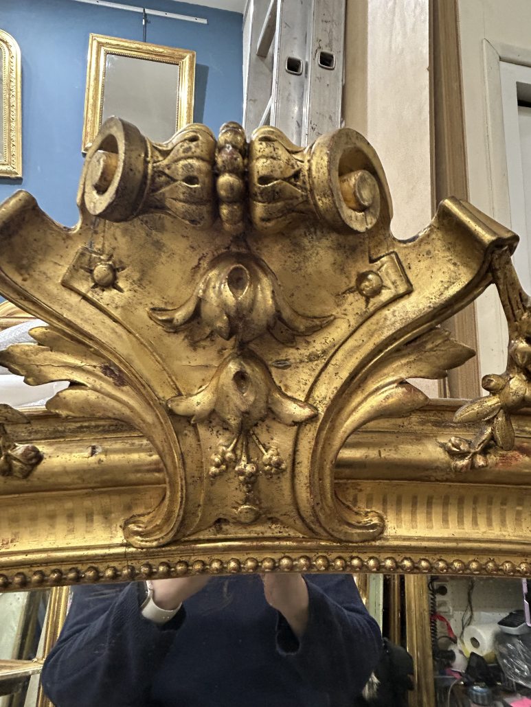 Miroir d’époque Louis-Philippe , avec un beau fronton Louis XV(environ 1860), en bois stuc et feuille d’or, gravée de traits et perles. Glace à l’argent ancienne.
