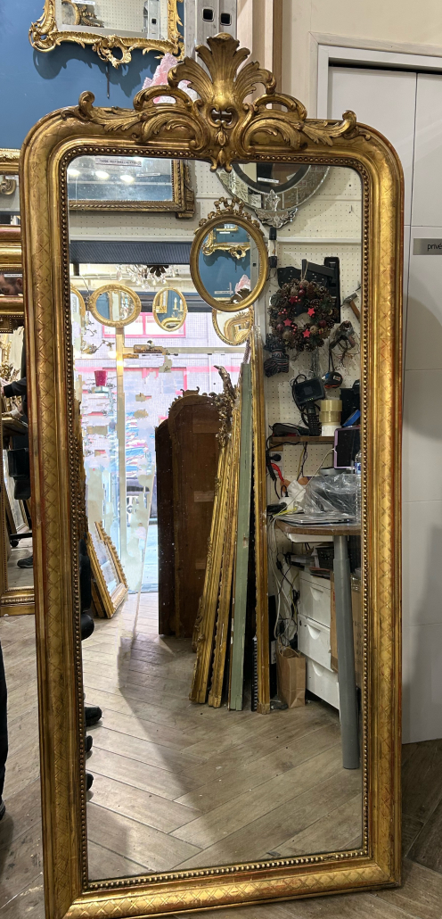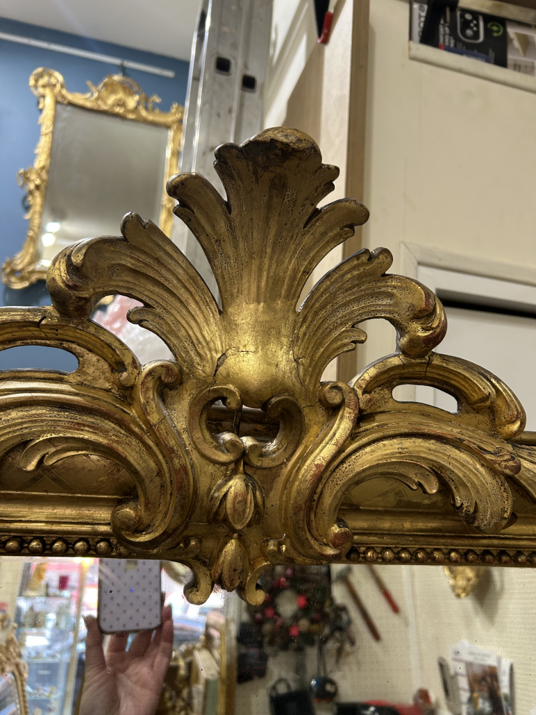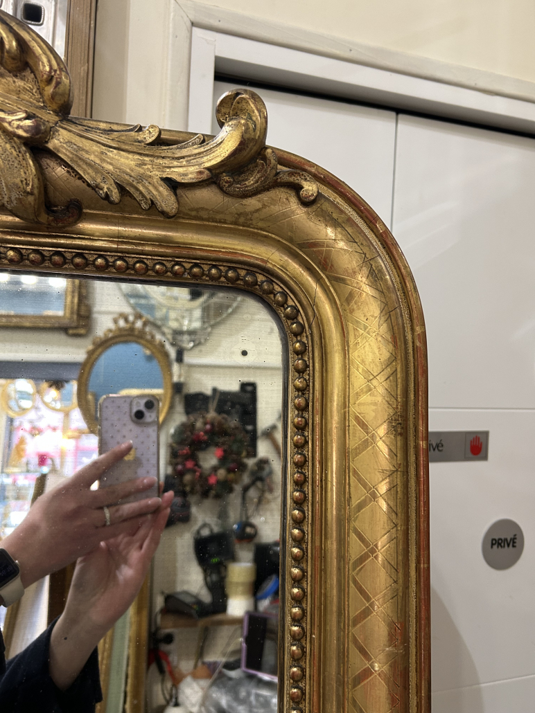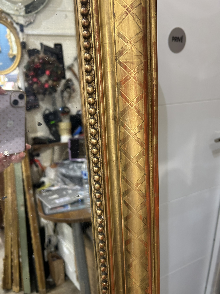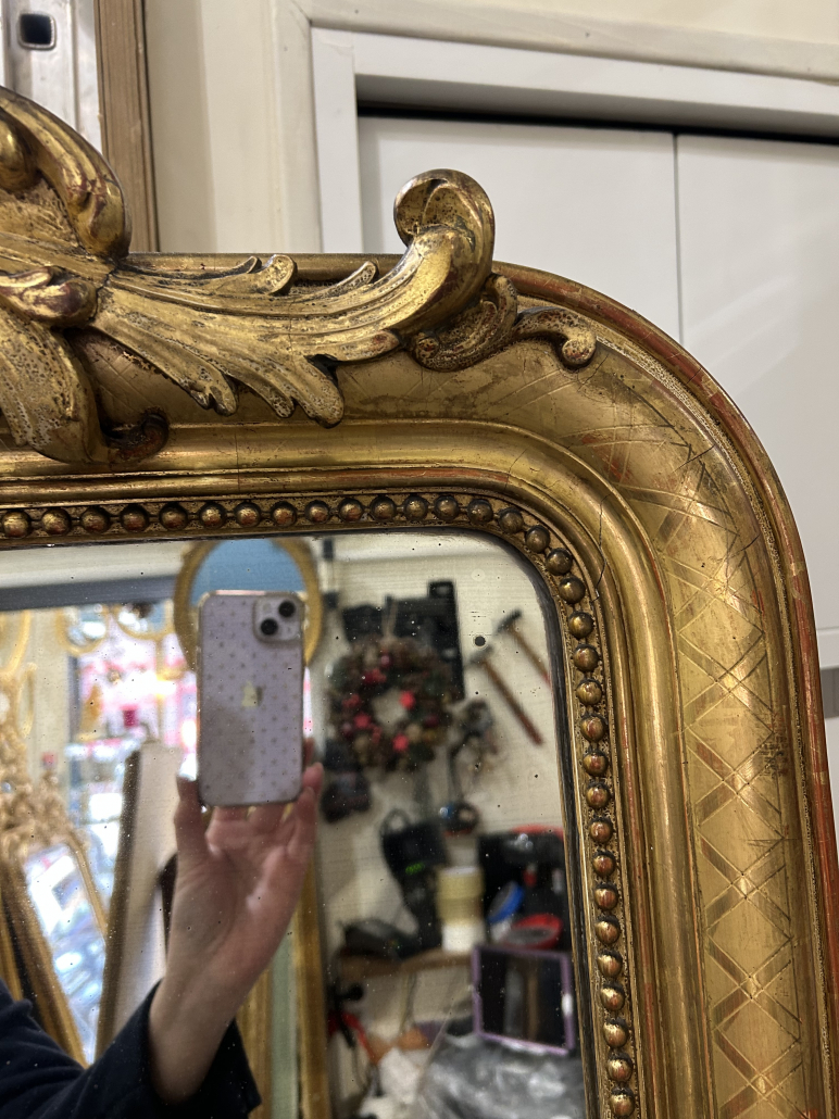 Miroir d’époque Louis-Philippe avec un fronton Louis XV étroit (environ 1850), en bois stuc et feuille d’or, gravée de croissillons et perles. Glace à l’argent ancienne piqué.