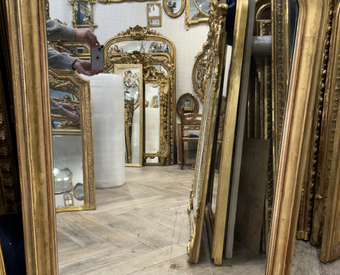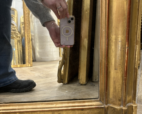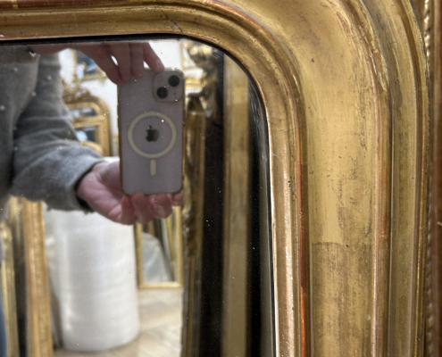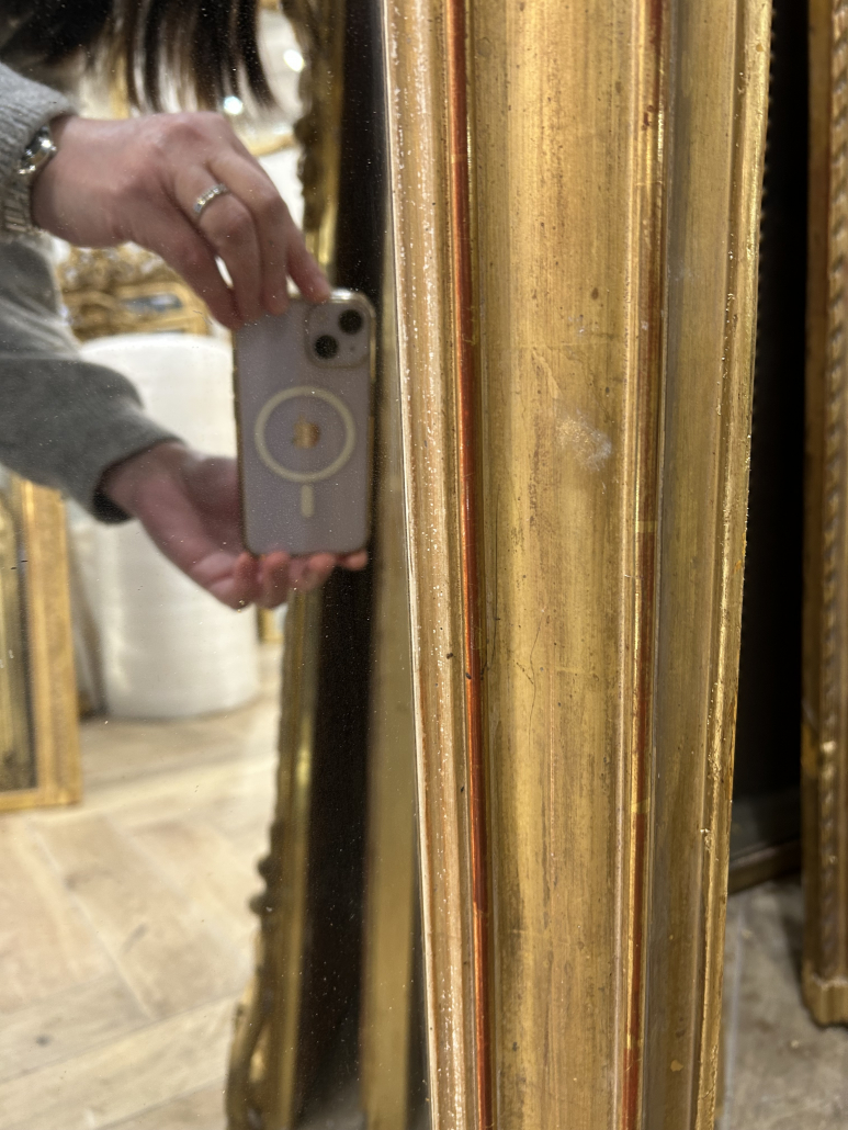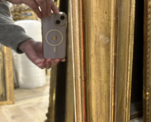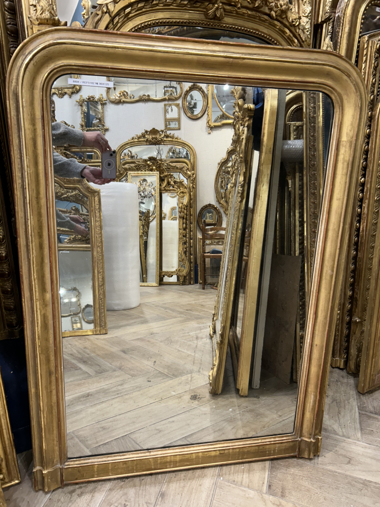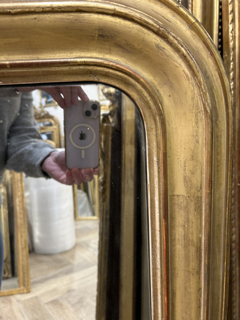 Miroir d’époque Louis-Philippe de cheminée (environ 1850), en bois stuc et feuille d’or. Glace au mercure ancienne.