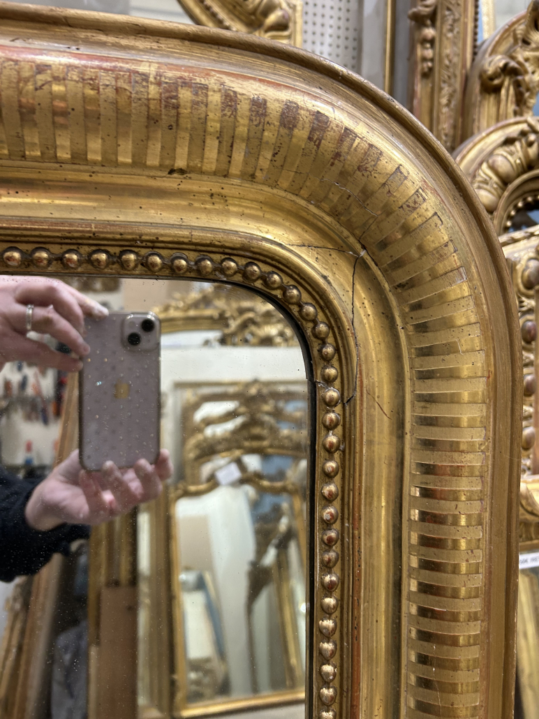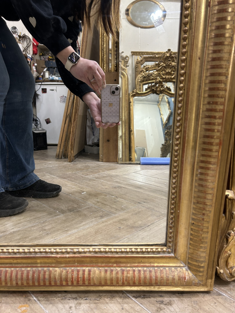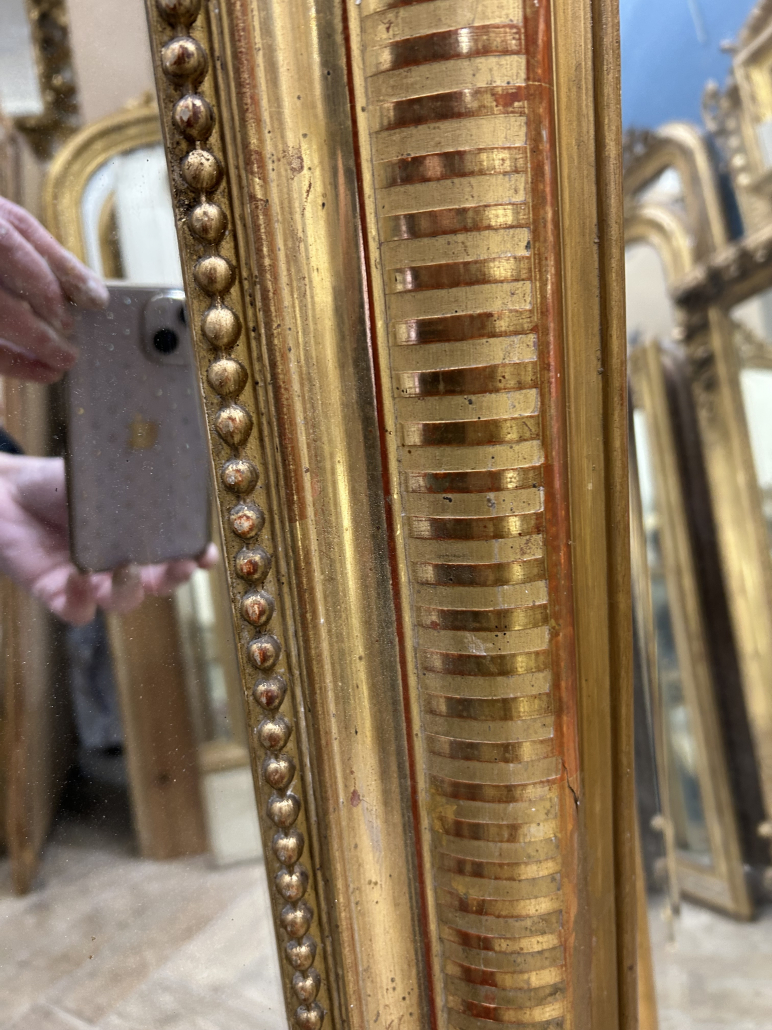 Miroir d’époque Louis-Philippe de cheminée (environ 1850), en bois stuc et feuille d’or, gravée de traits