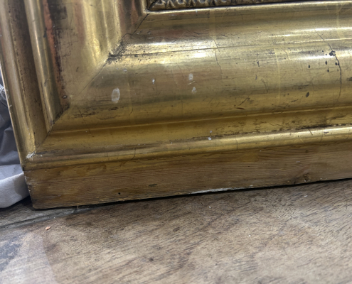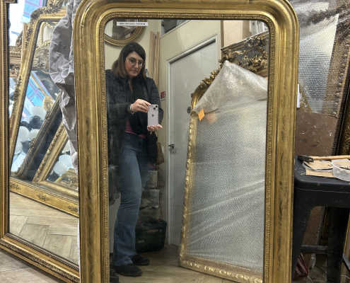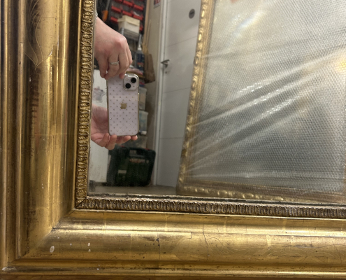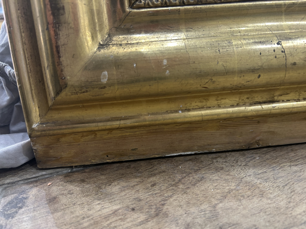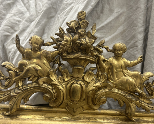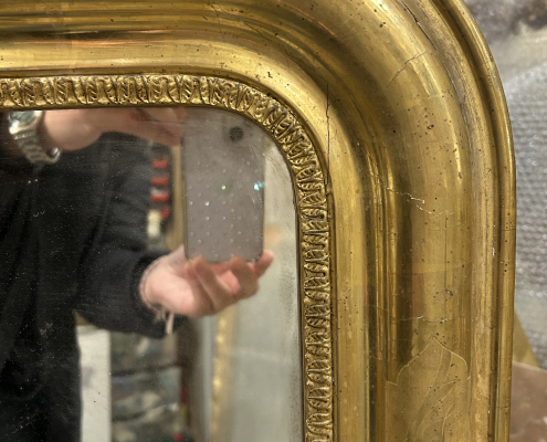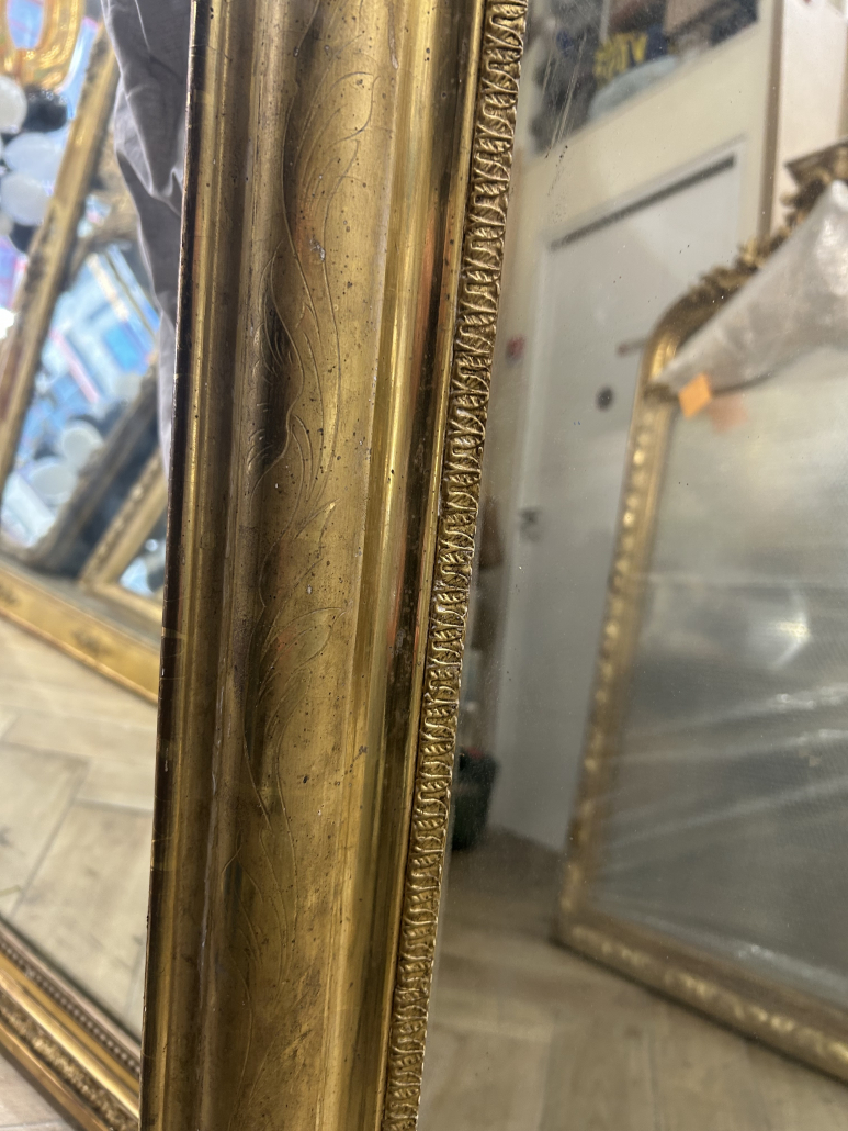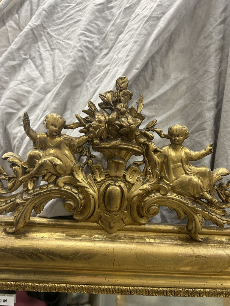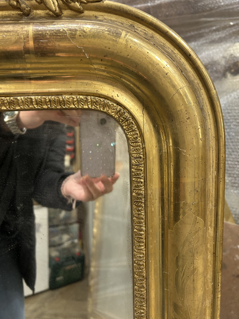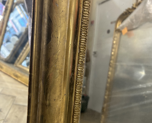 Miroir d’époque Louis-Philippe (environ 1850), en bois stuc et feuille d’or, gravée de fleurs et perles, fronton deux personnages. Glace à l’argent ancienne.