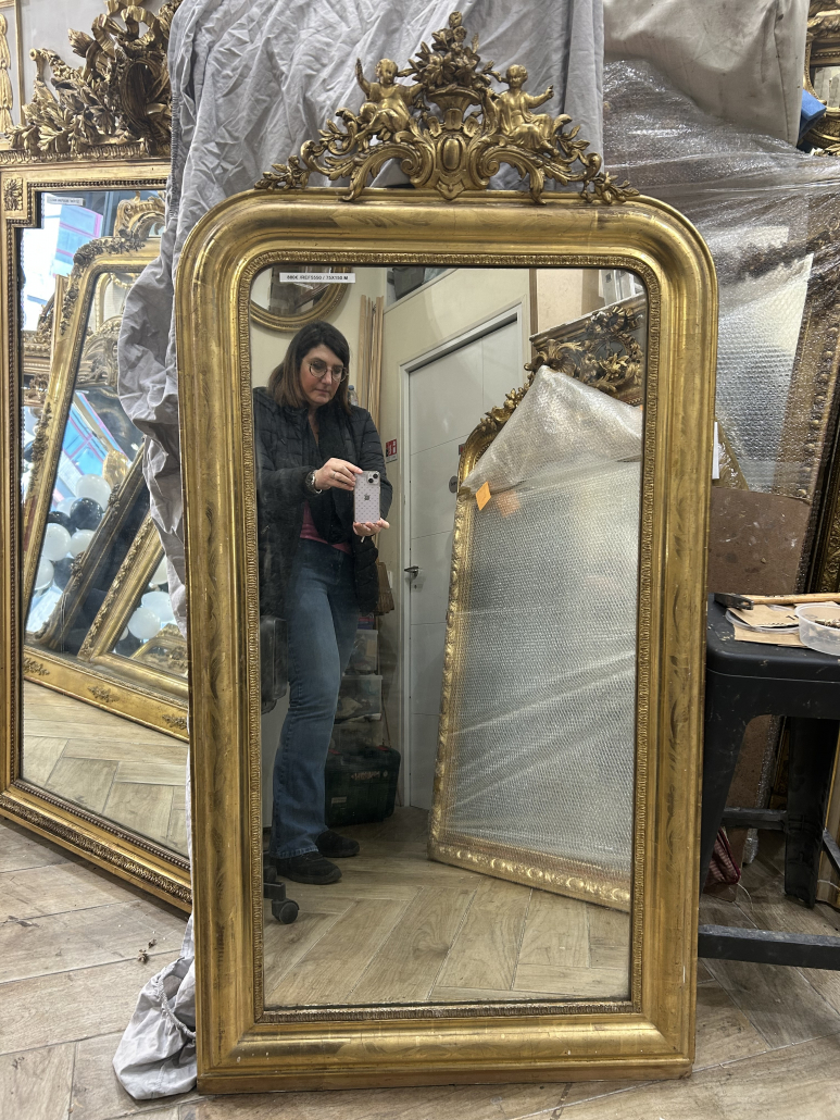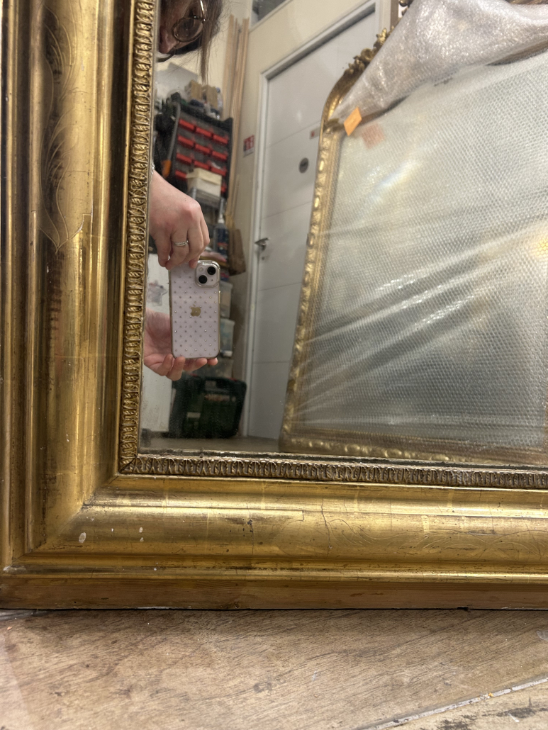 Mantle Trumeau époque Louis-Philippe made of gilt wood and stuc (gold leaves). Antique silver Glass