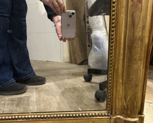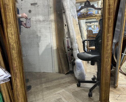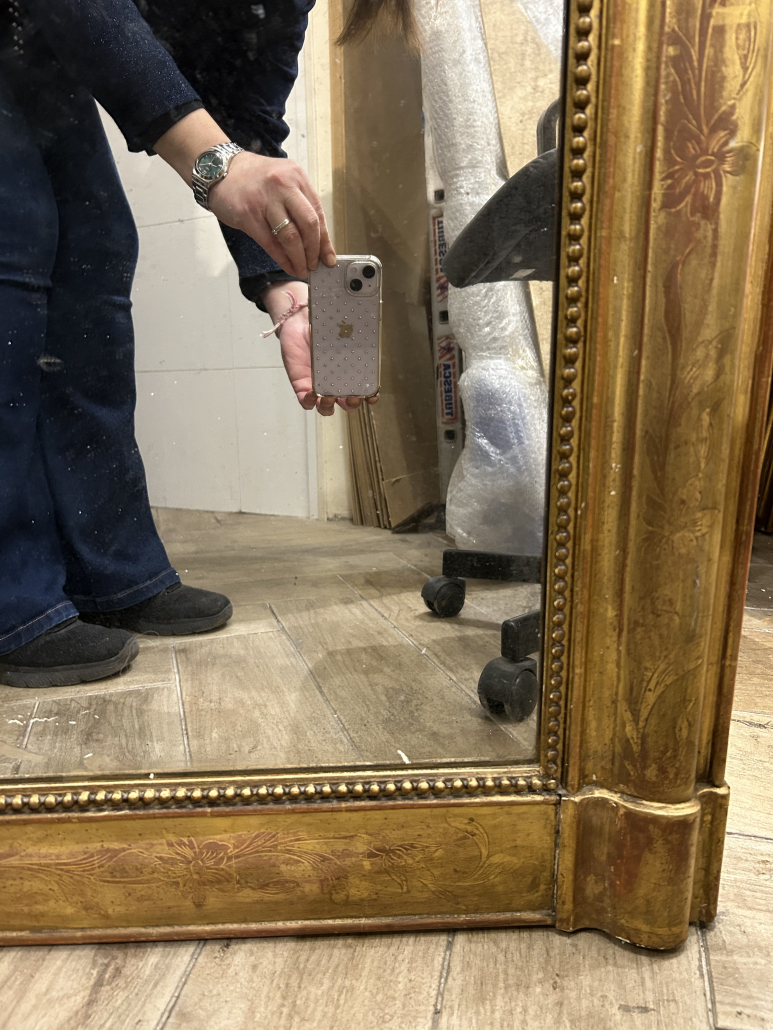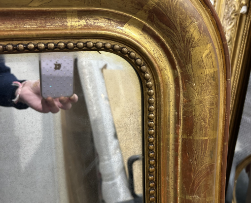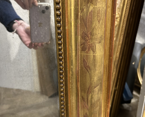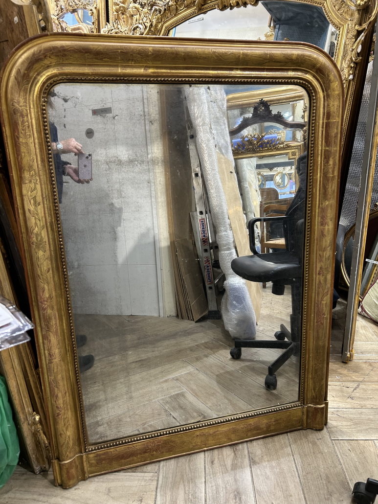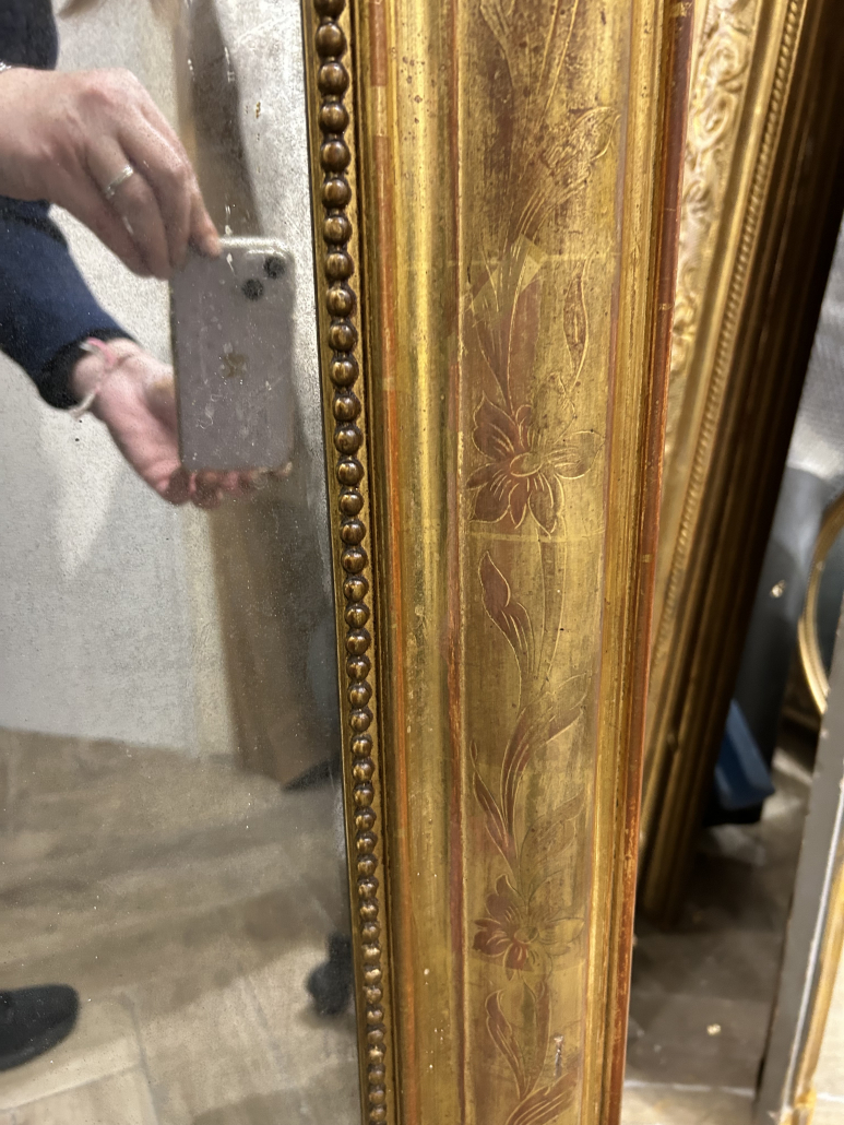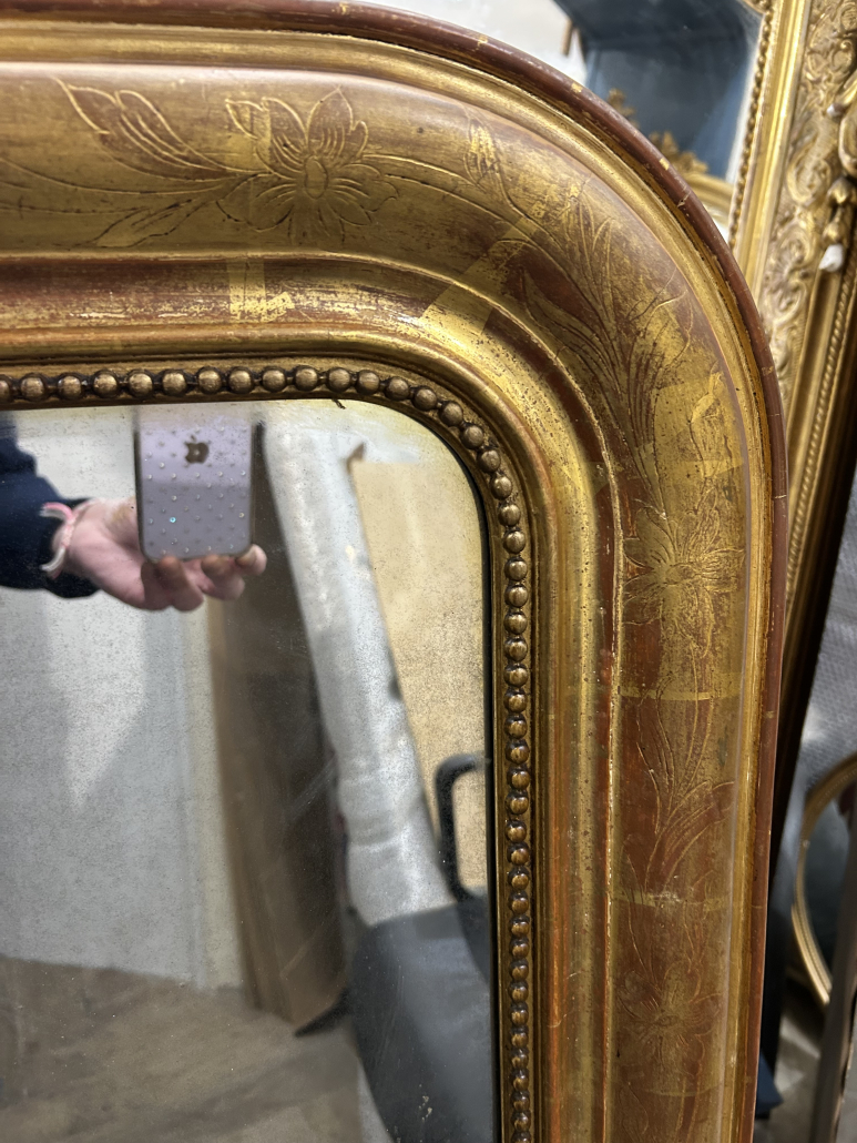 Miroir d’époque Louis-Philippe de cheminée (environ 1850), en bois stuc et feuille d’or, gravée de fleurs et perles. Glace au mercure ancienne. piquée