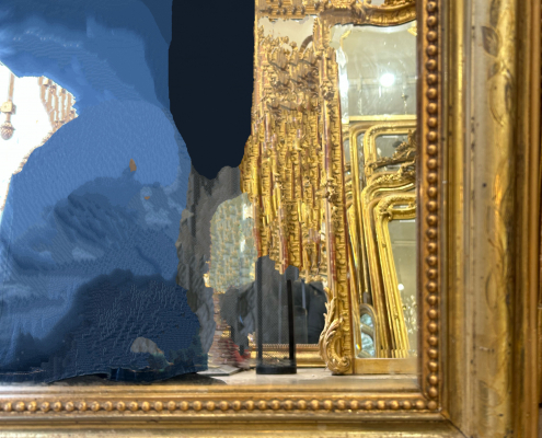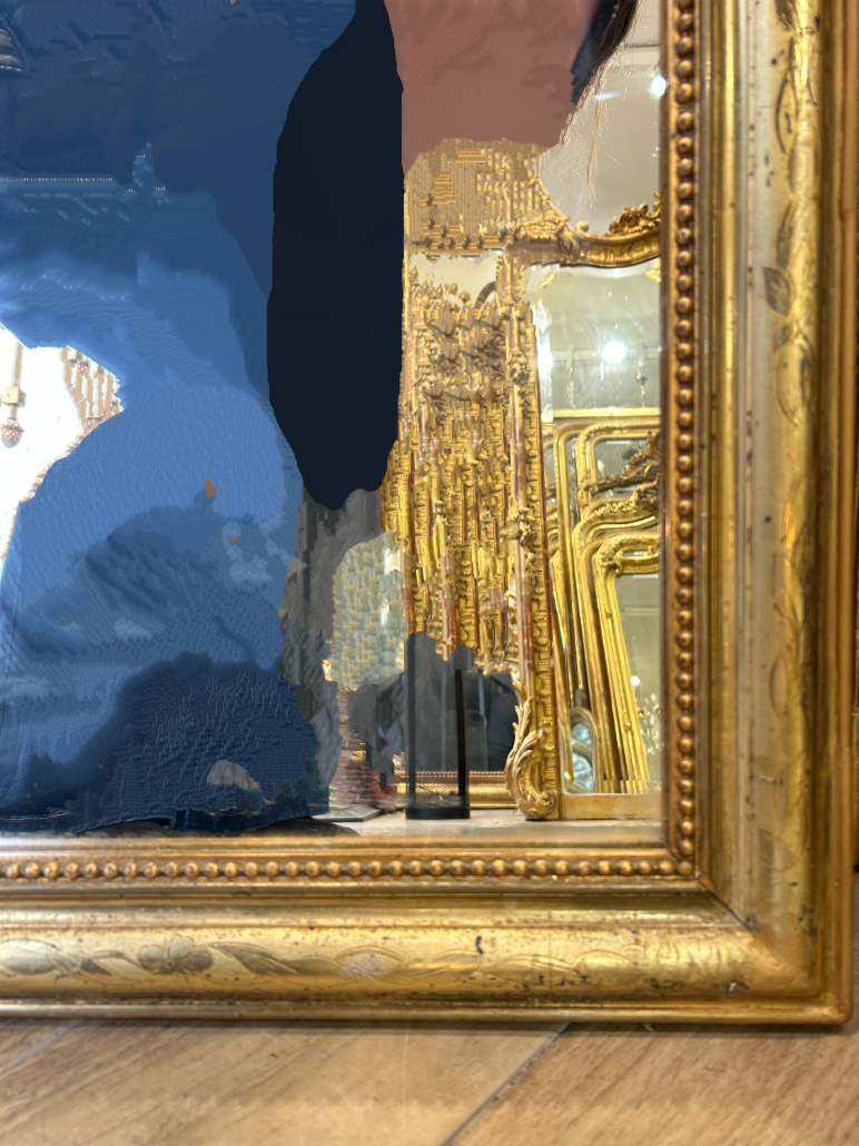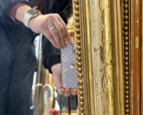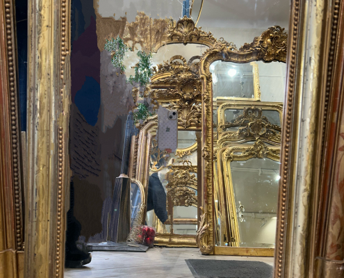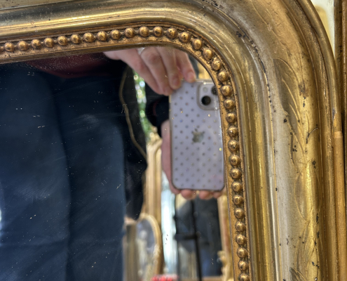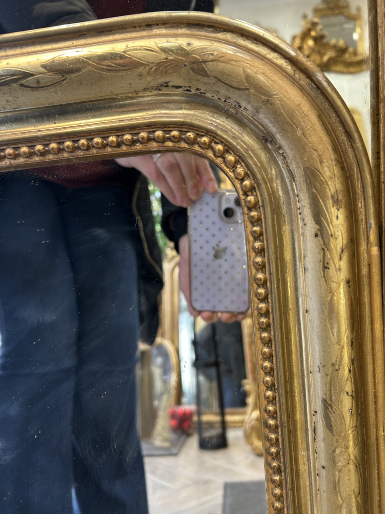 Miroir d’époque Louis-Philippe (environ 1850), en bois stuc et feuille d’or, gravée de fleurs et perles. Glace à l’argent ancienne.