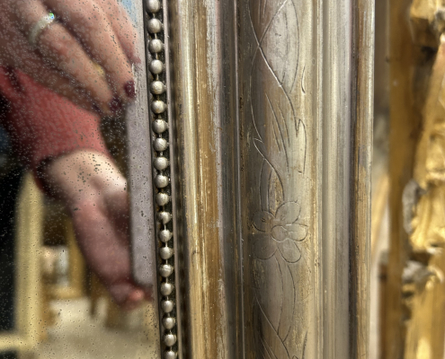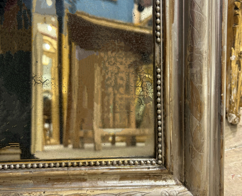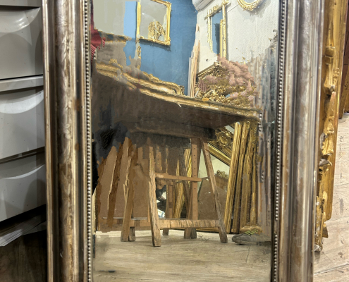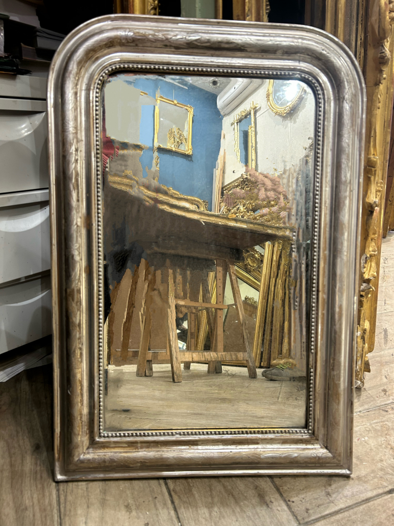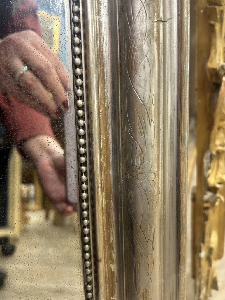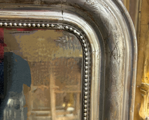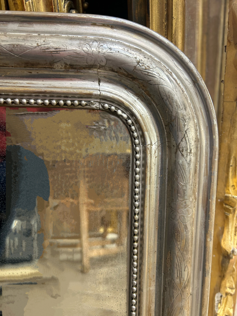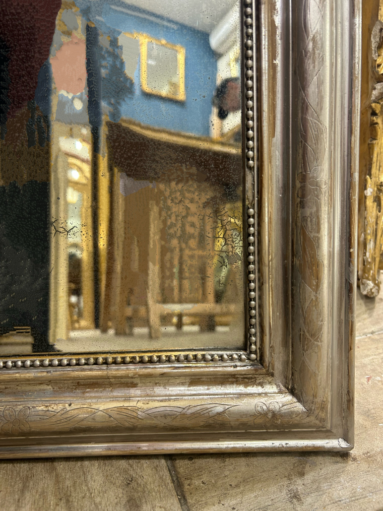 Miroir d’époque Louis-Philippe (environ 1850), en bois stuc et feuille d’argent, gravée de fleurs et perles. Glace à l’argent ancienne, piquée.