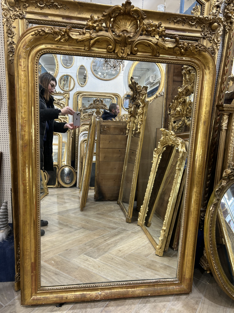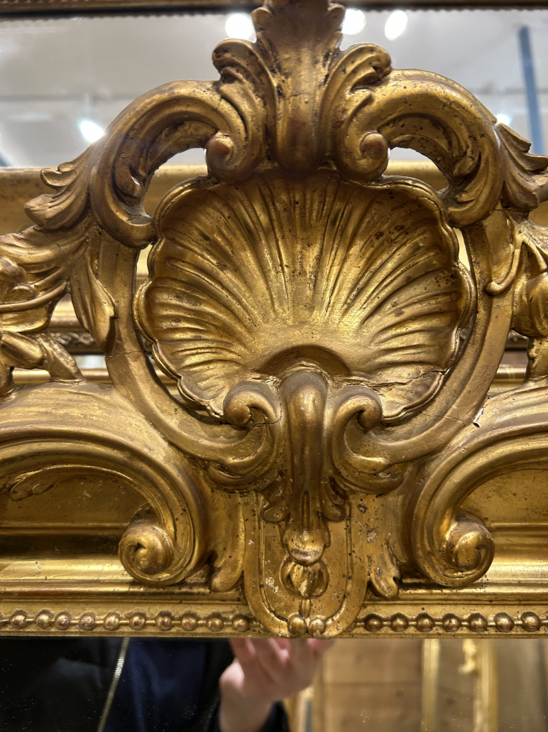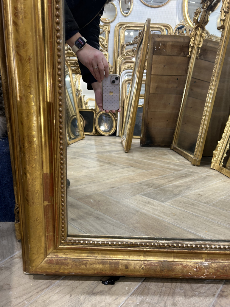 Miroir d’époque Louis-Philippe avec un fronton Louis XV (environ 1850), en bois stuc et feuille d’or, gravée de fleurs et perles. Glace à l’argent ancienne.