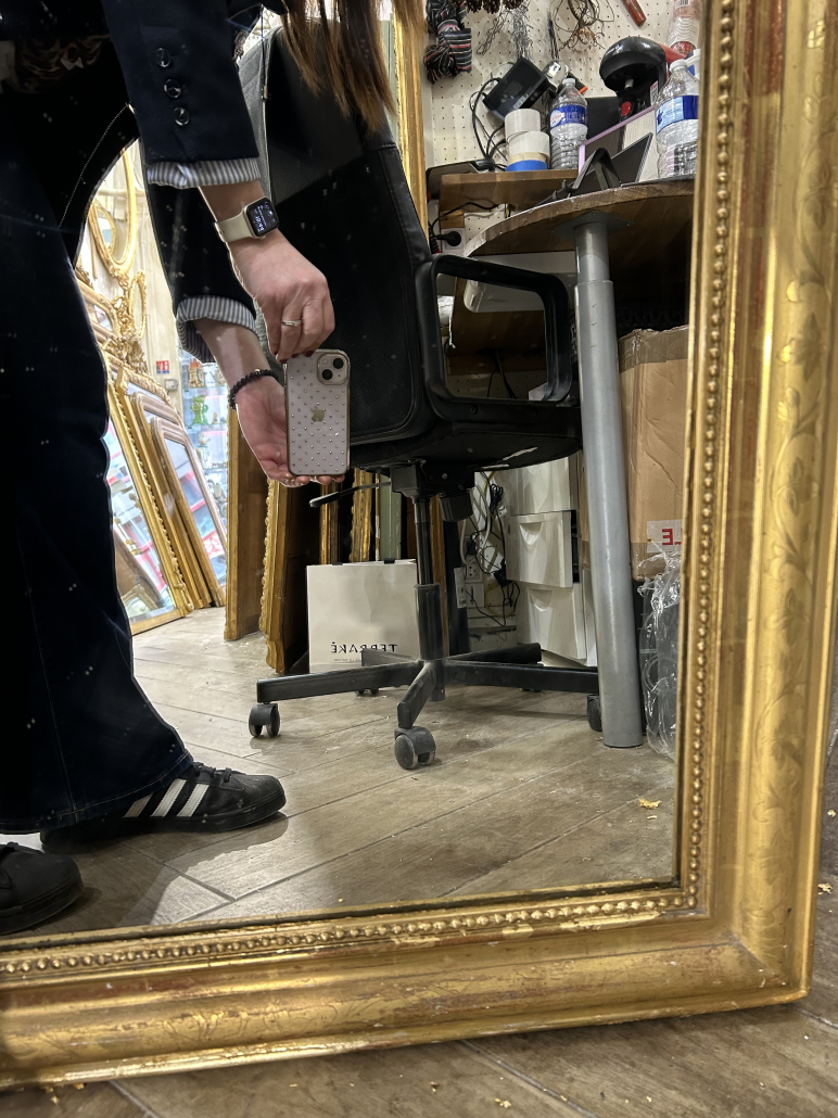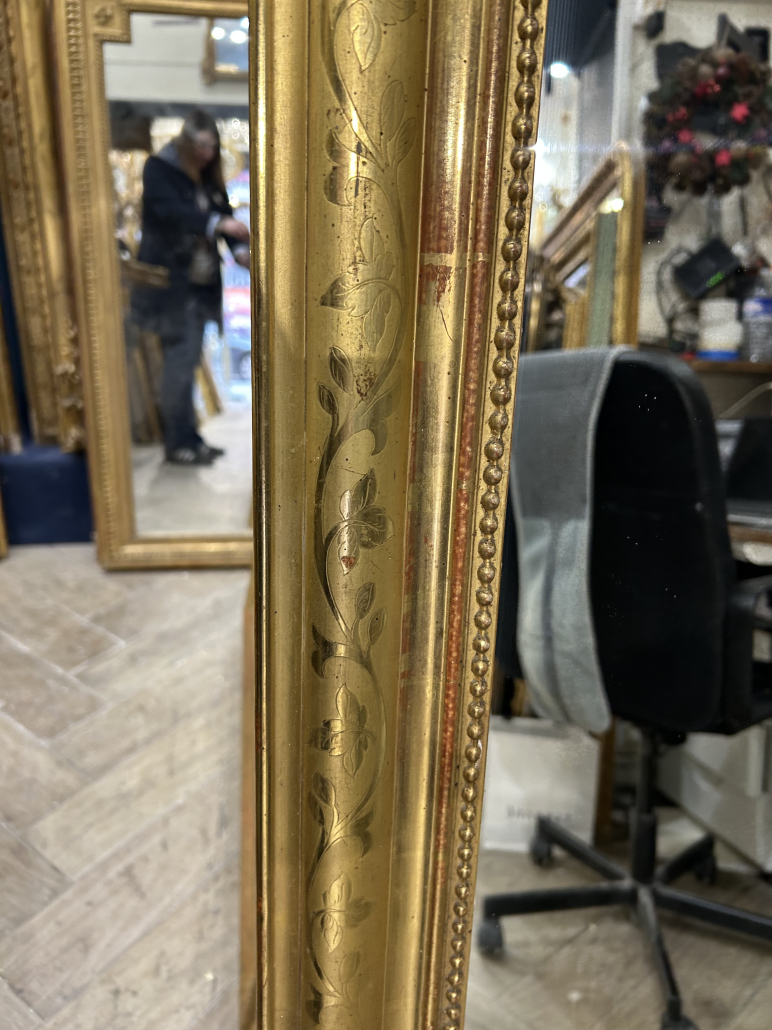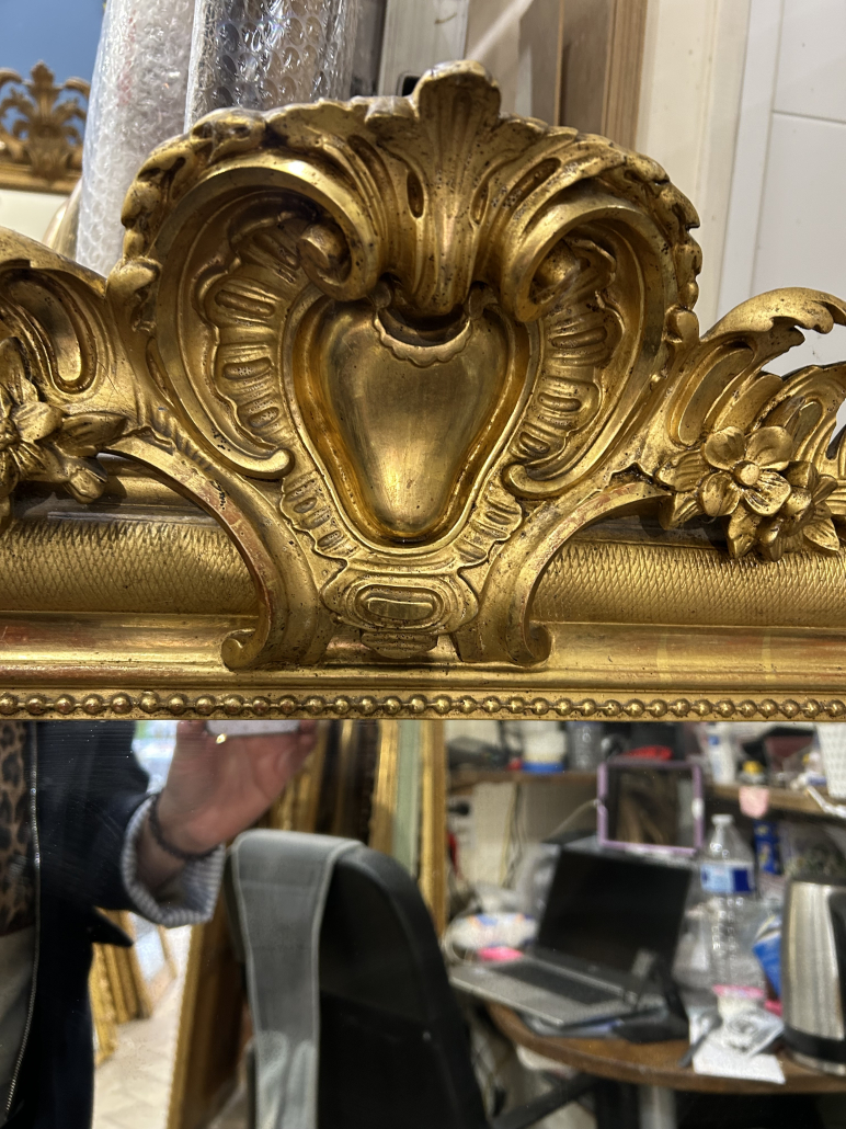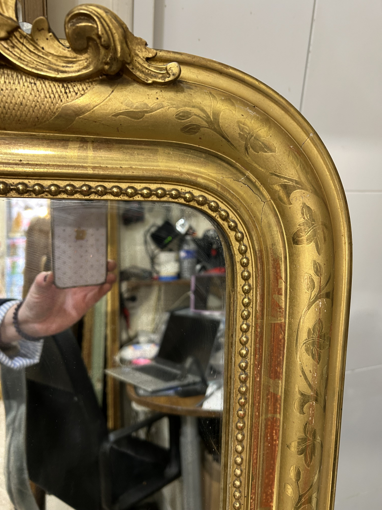 Miroir d’époque Louis-Philippe avec un fronton Louis XV (environ 1850), en bois stuc et feuille d’or, gravée de fleurs et perles. Glace à l’argent ancienne.