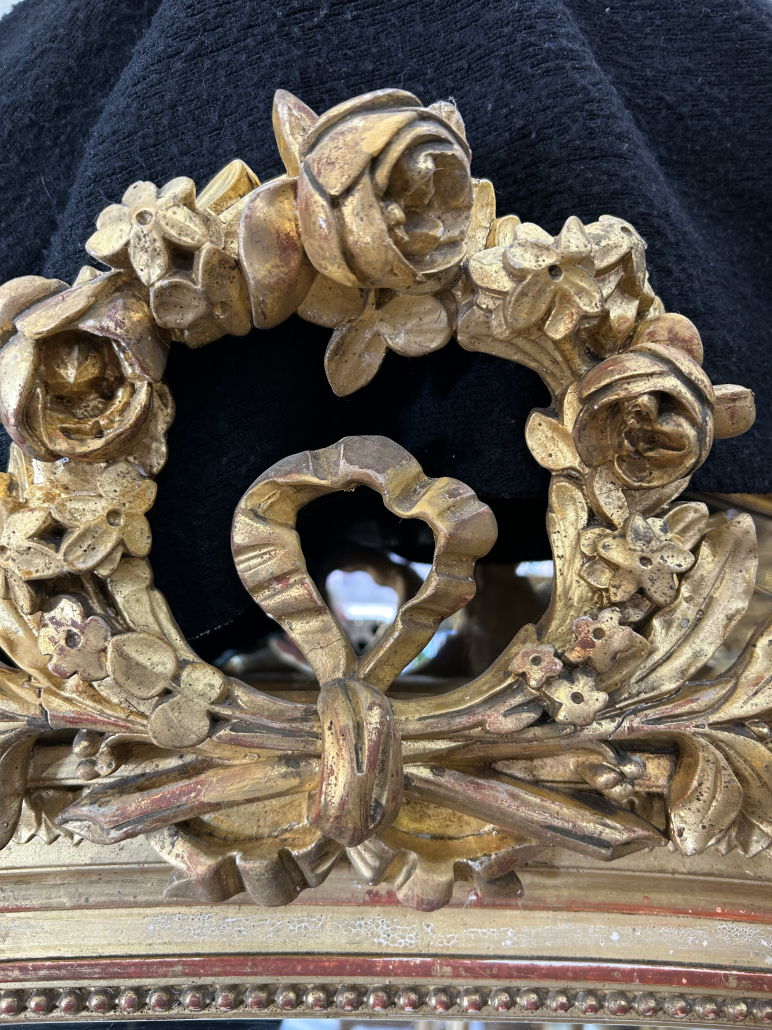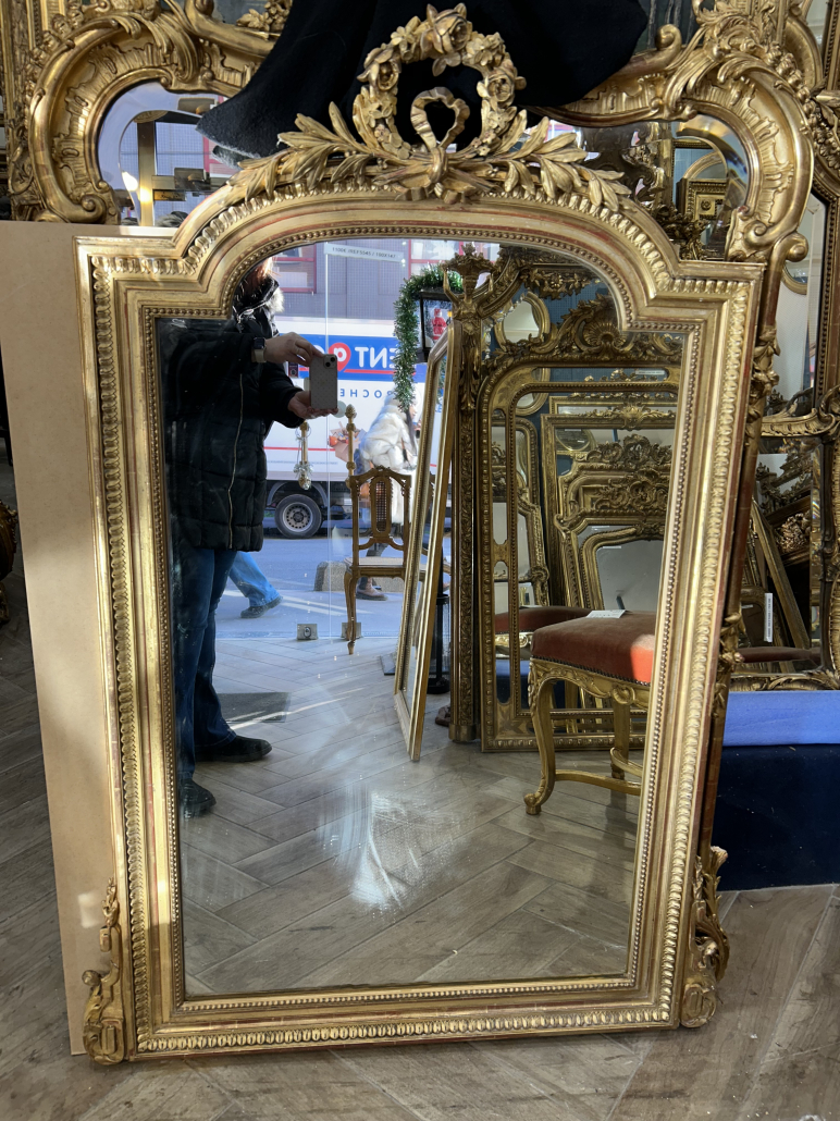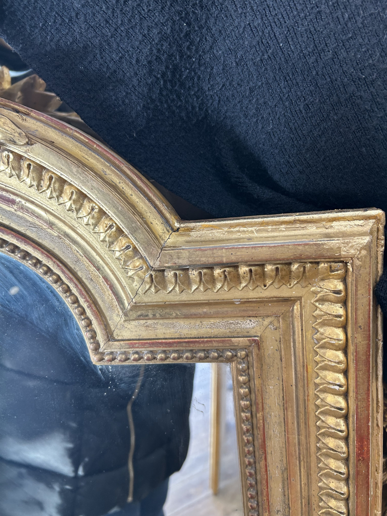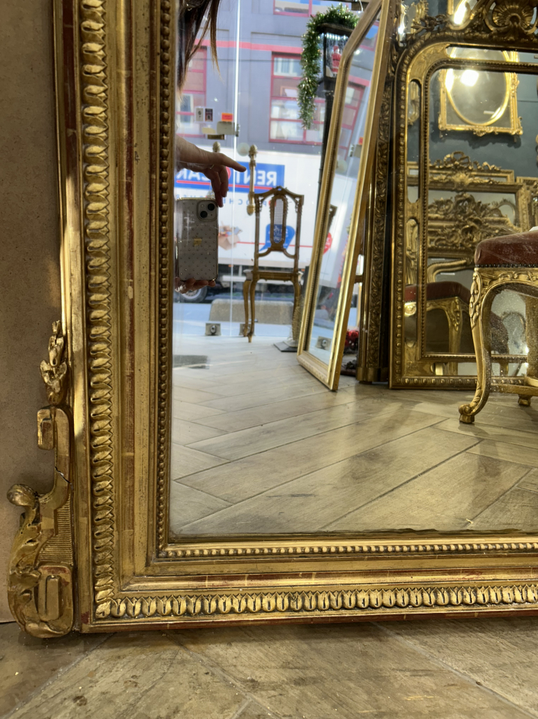 Miroir d’époque Napoléon III de style Louis XVI (environ 1880), en bois, stuc et feuille d’or, fronton Louis XVI. Glace à l’argent ancienne.