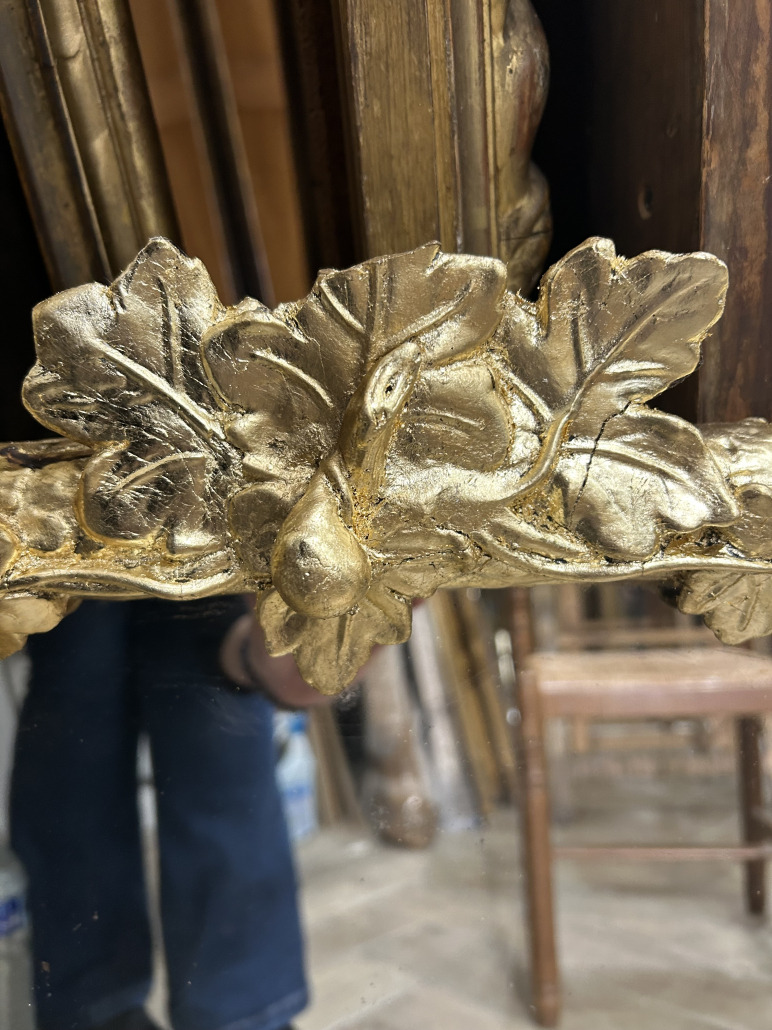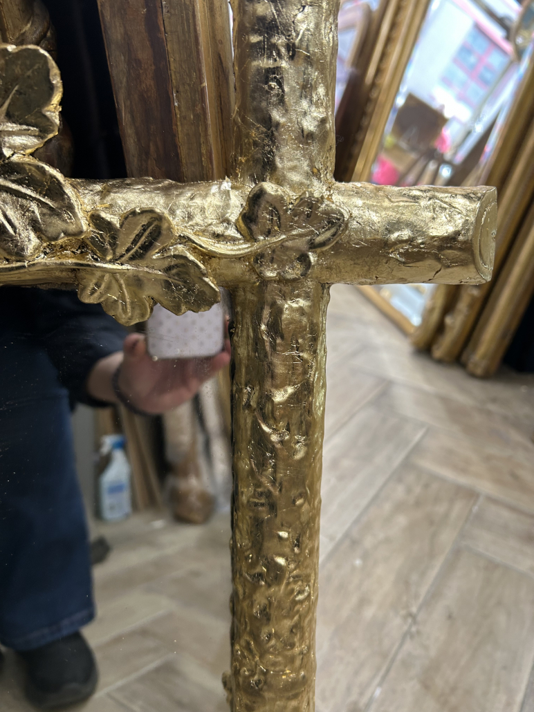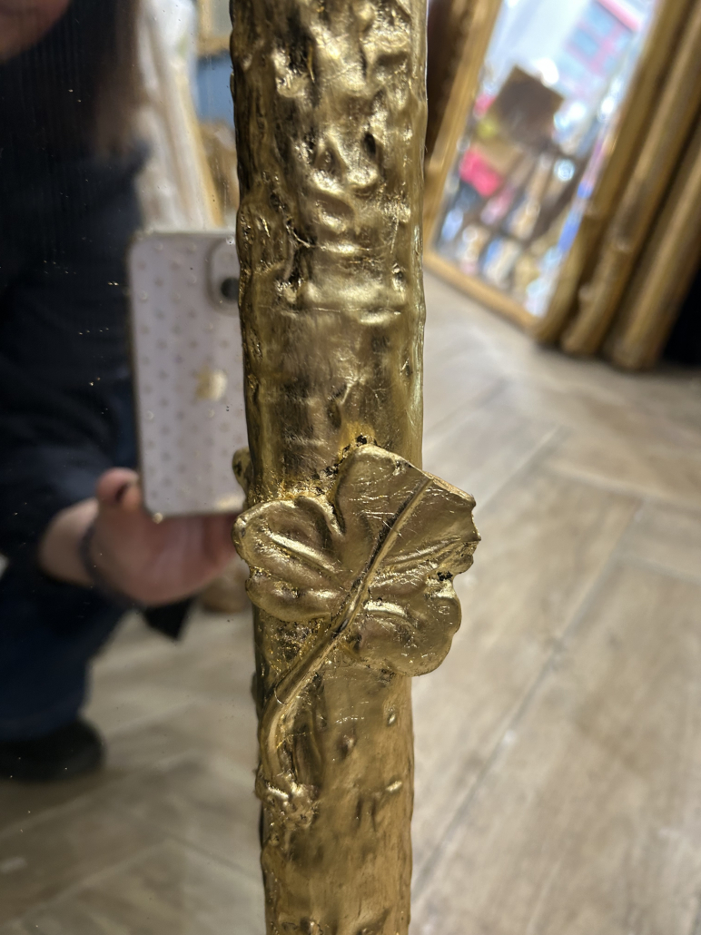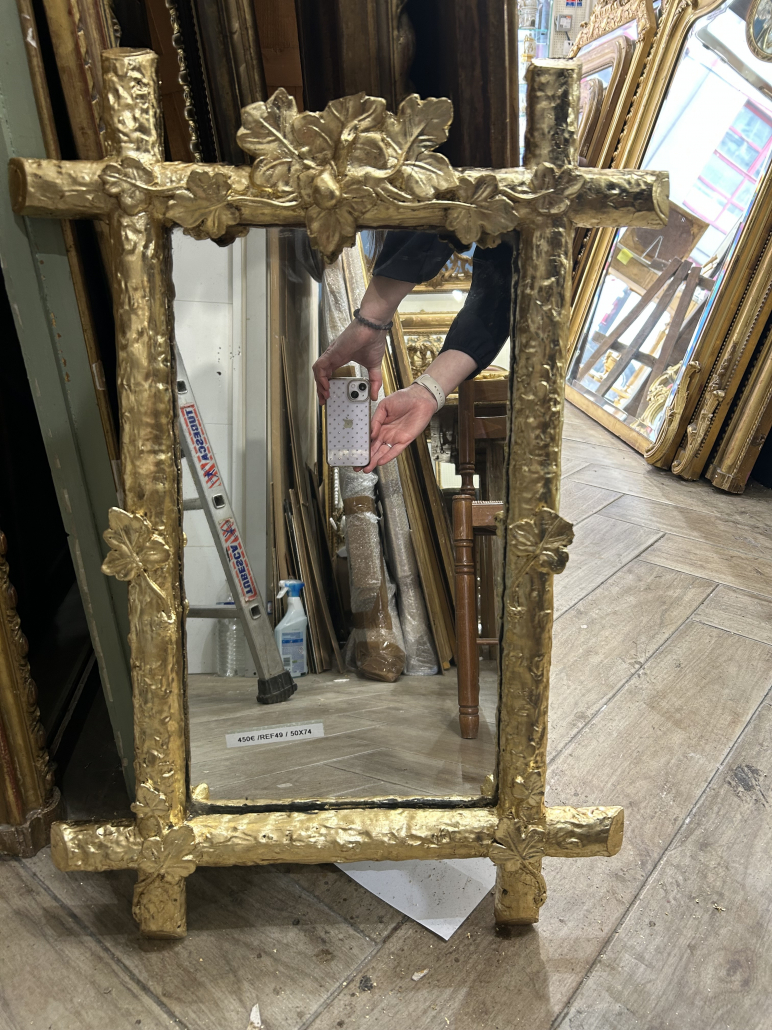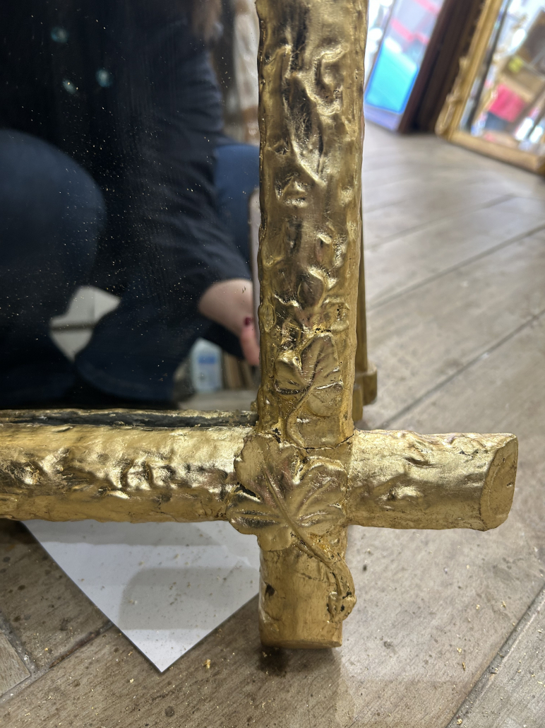 Miroir d’époque Napoléon III de style Louis XV (environ 1880) . en bois stuc et feuille de cuivre. Fronton feuillage. Glace tain à l’argent ancienne.