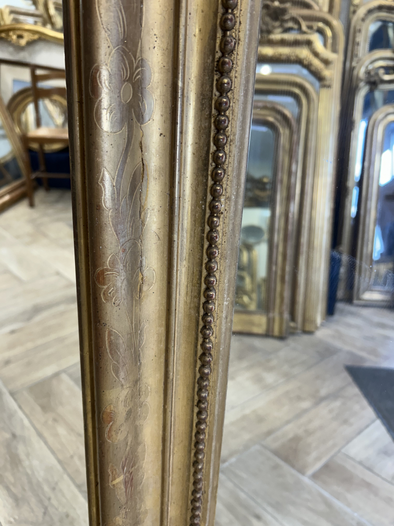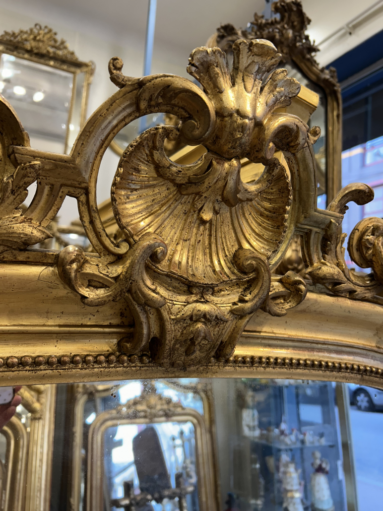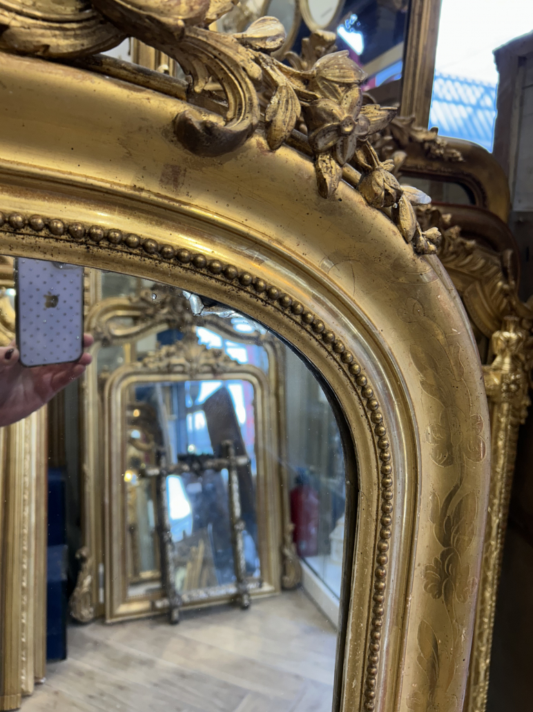 Miroir d’époque Napoléon III de style Louis XV (environ 1870) de cheminée. en bois stuc et feuille d’or. cadre gravée de fleurs. Fronton ajouré et perles. Glace tain à l’argent ancienne.