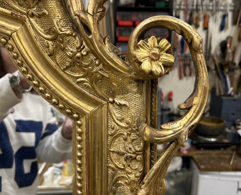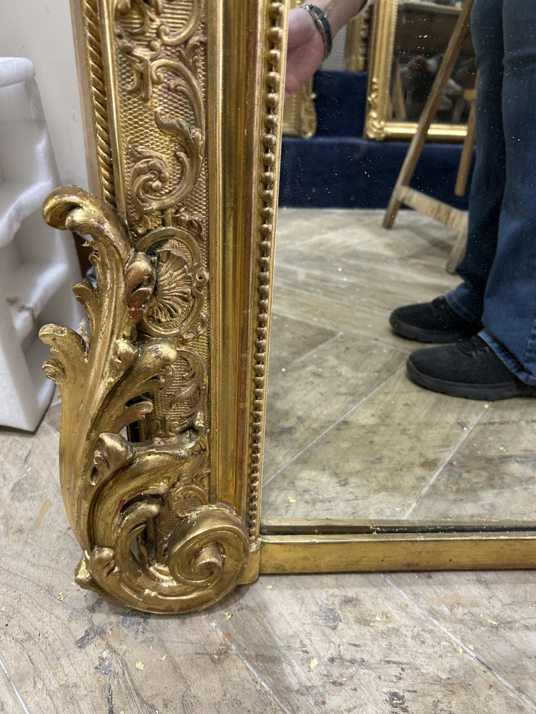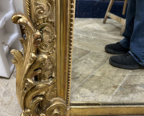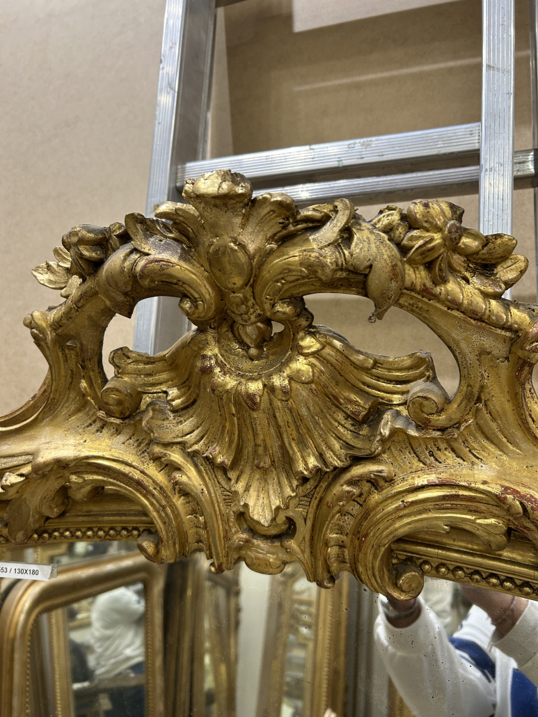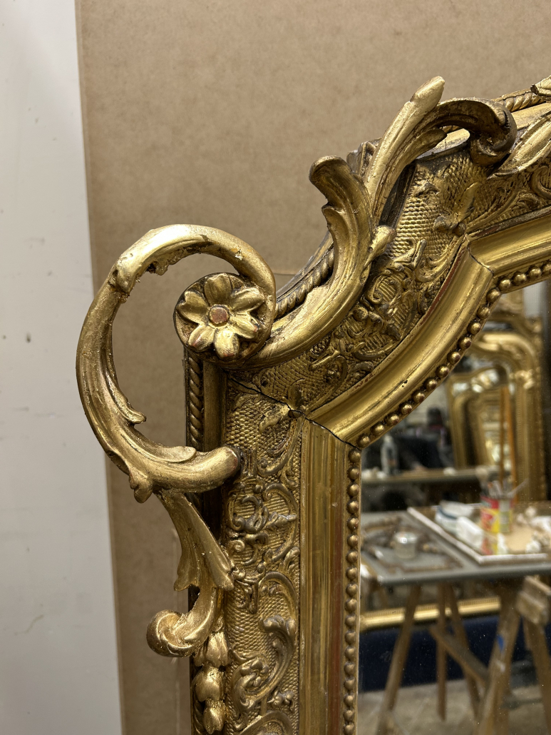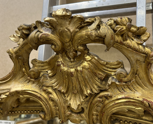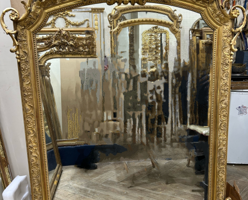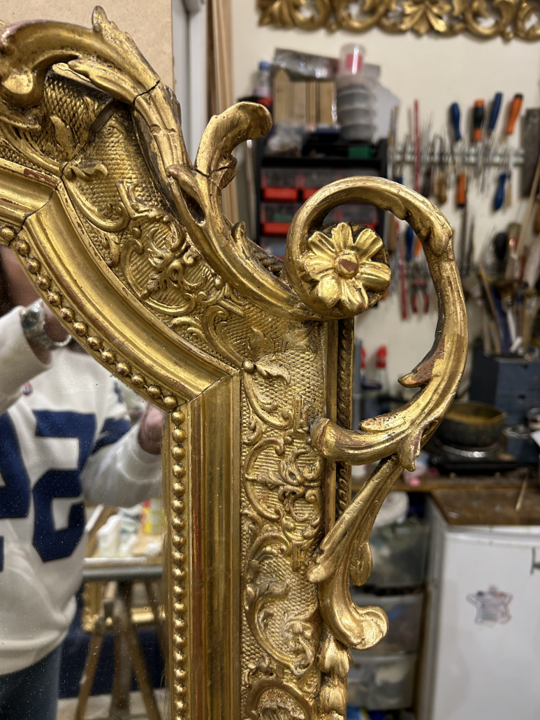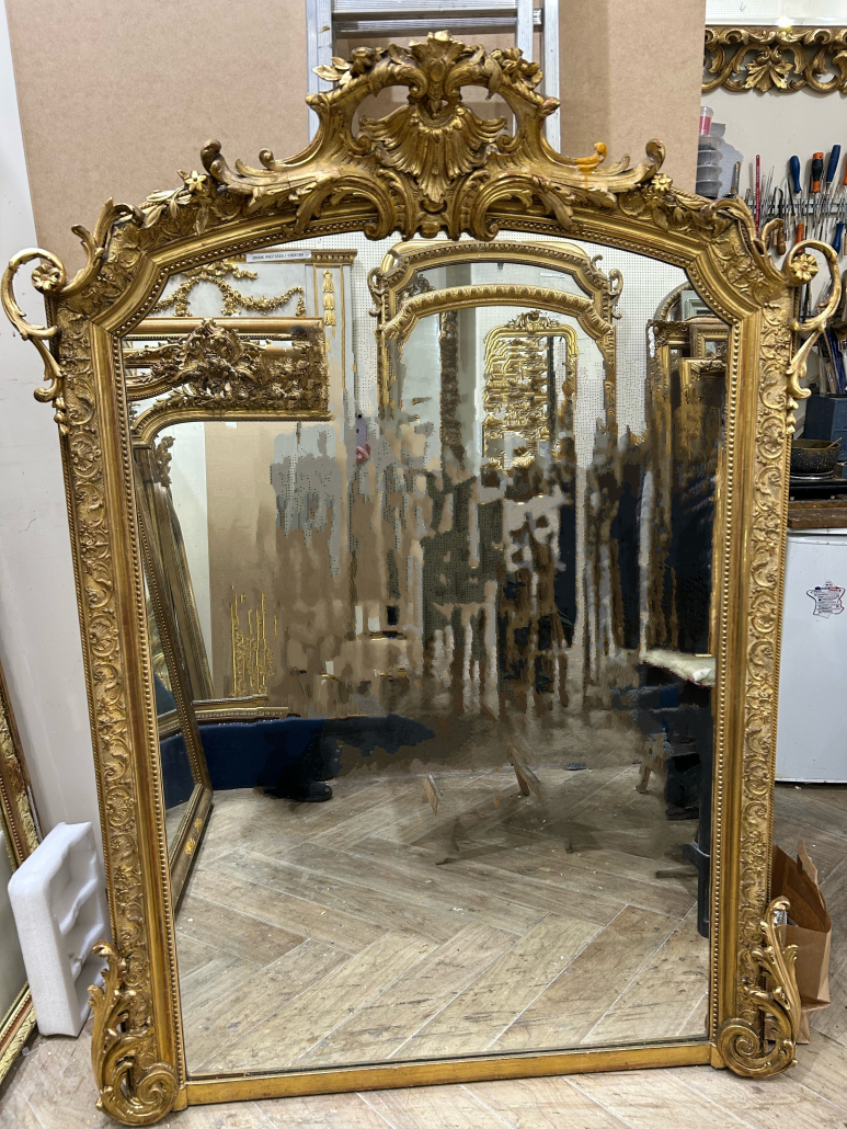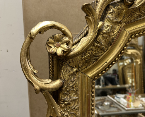 Miroir d’époque Napoléon III de style Louis XV (environ 1880) de cheminée. en bois stuc et feuille d’or. Fronton ajouré et perles. Glace tain à l’argent ancienne.