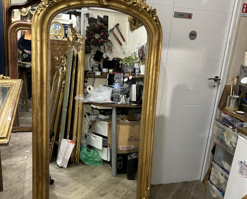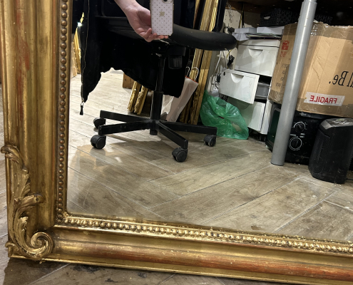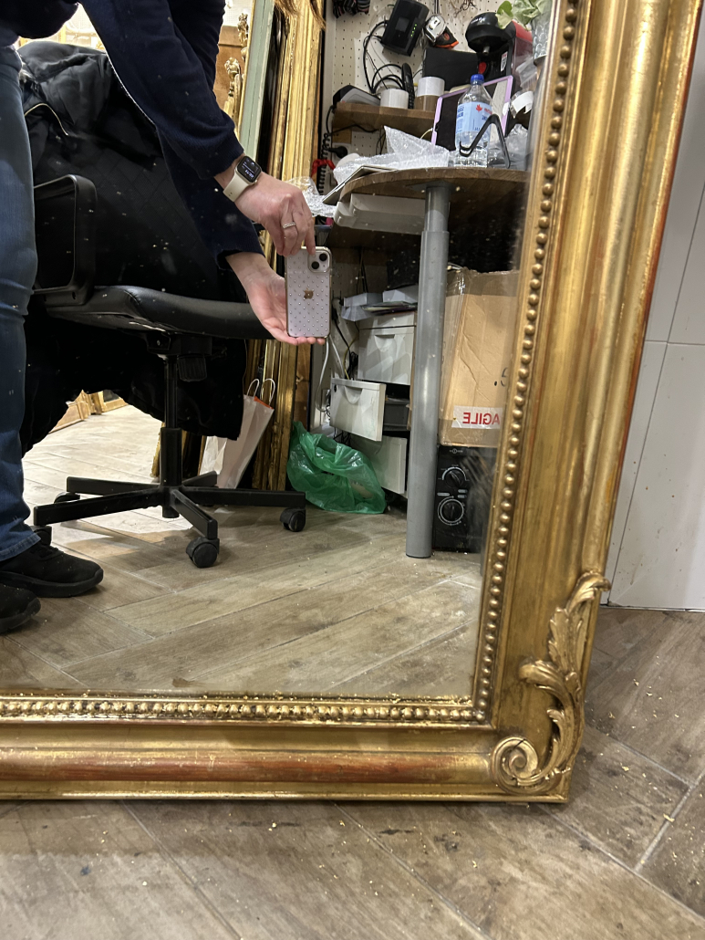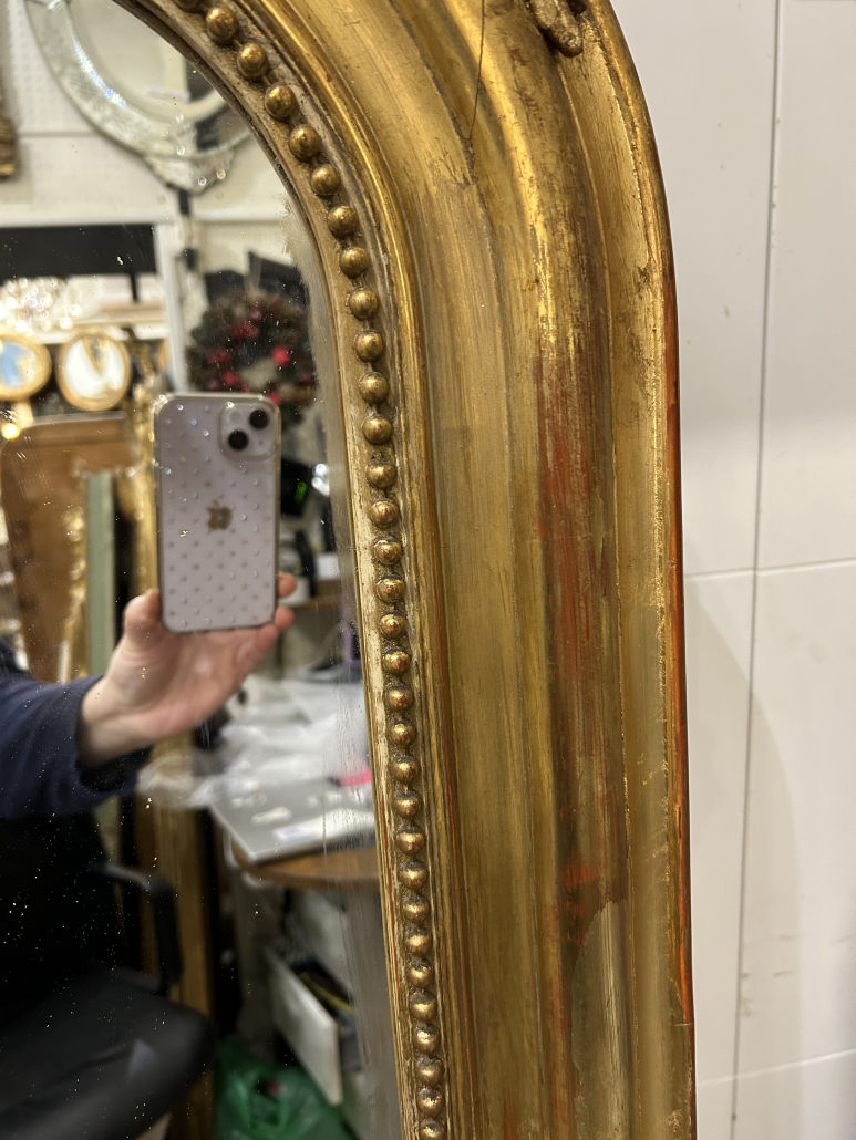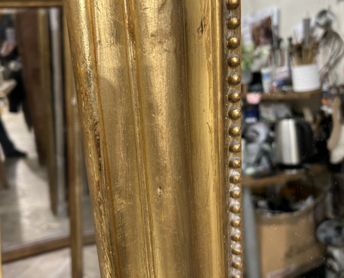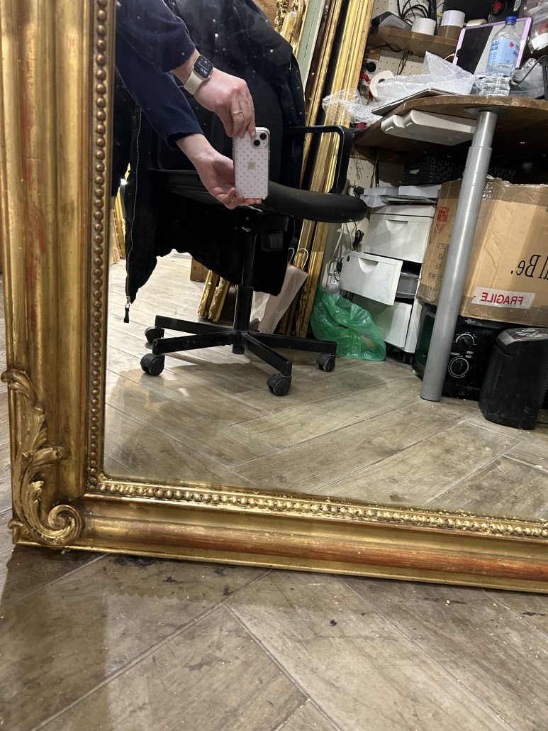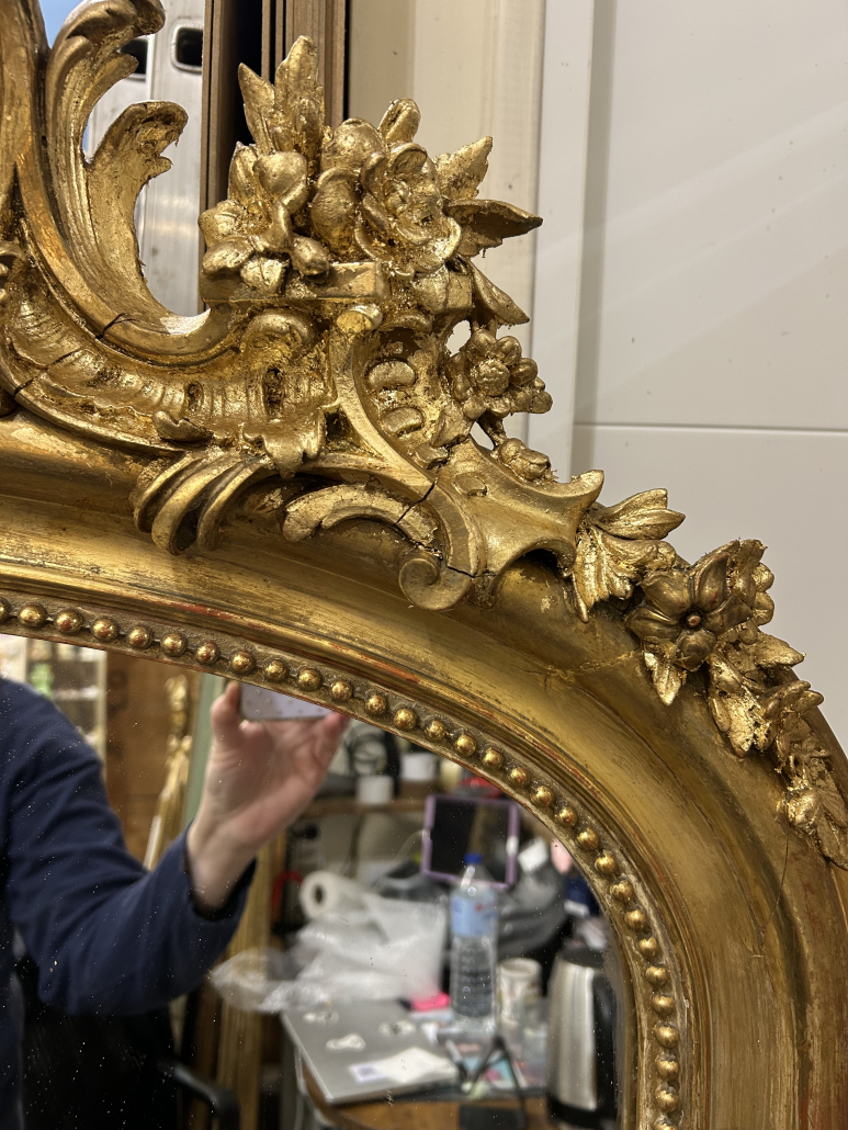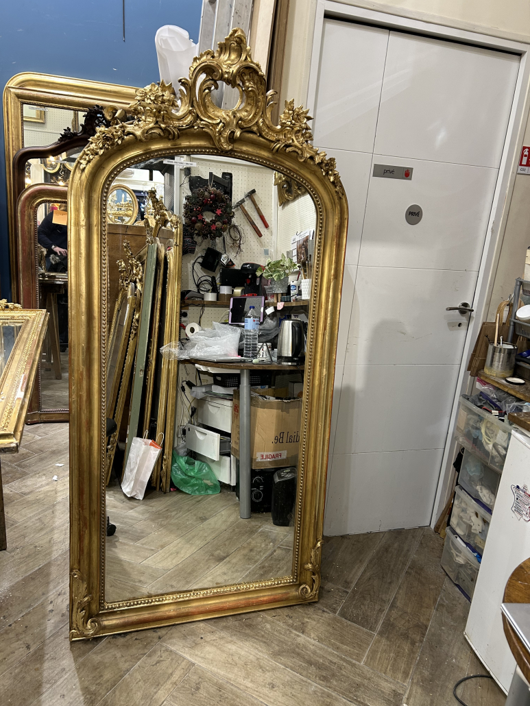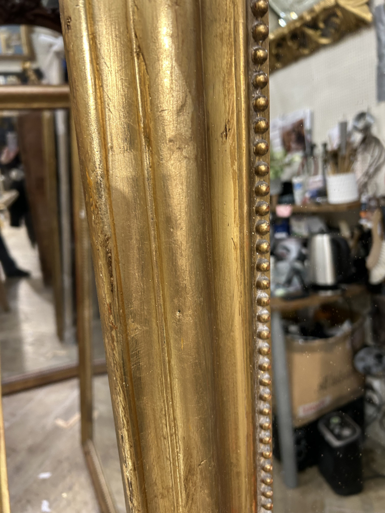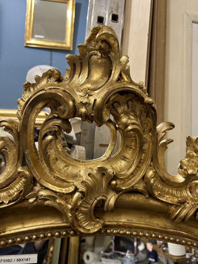 Miroir d’époque Napoléon III de style Louis XV (environ 1880). en bois stuc et feuille d’or. Fronton ajouré et perles. Glace tain à l’argent neuve.