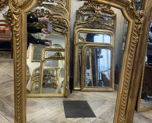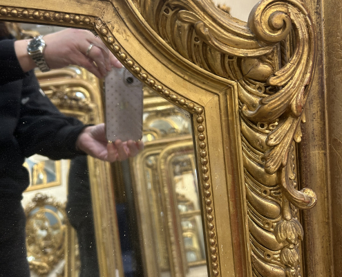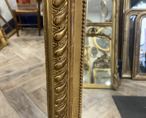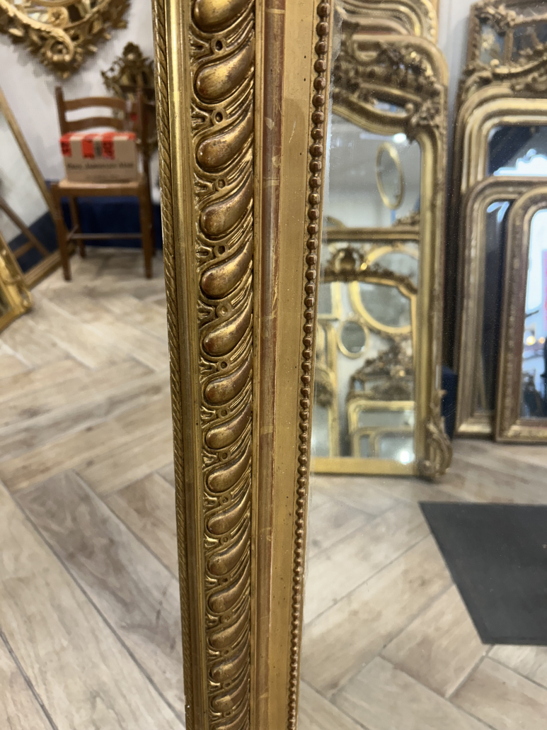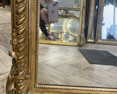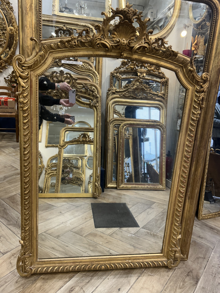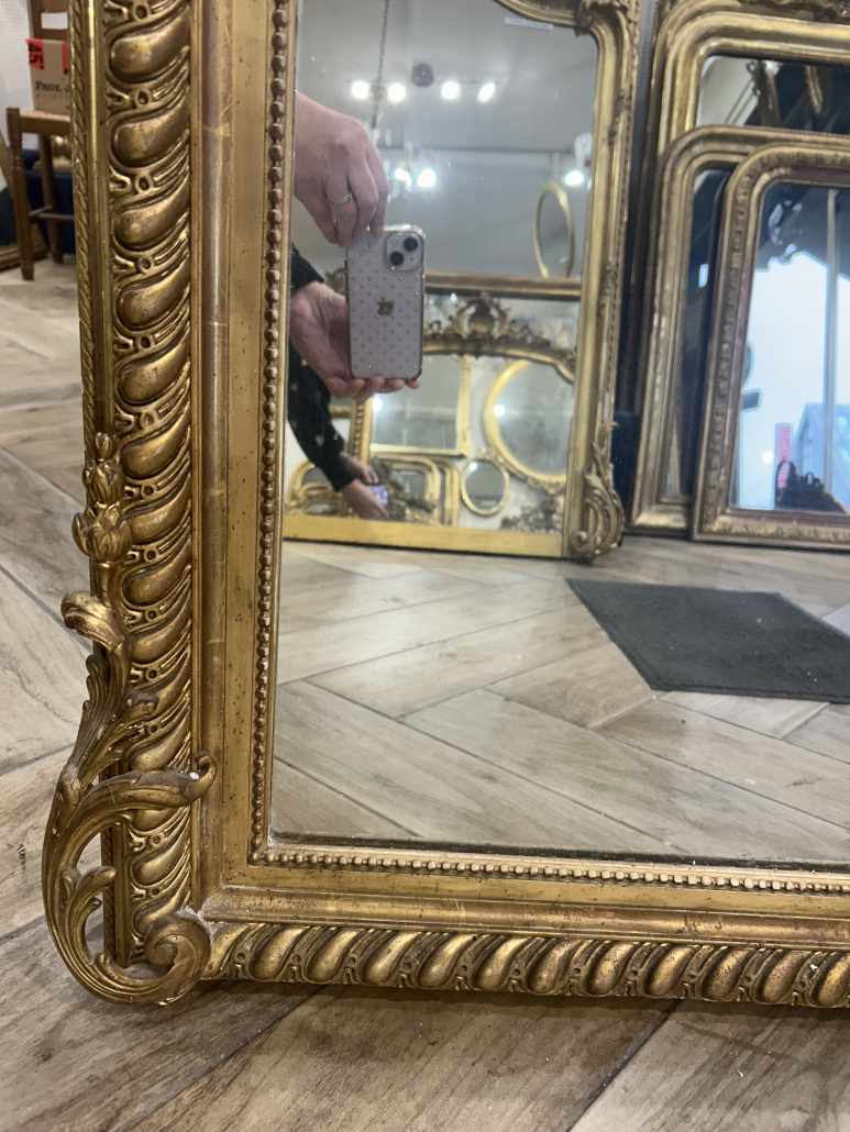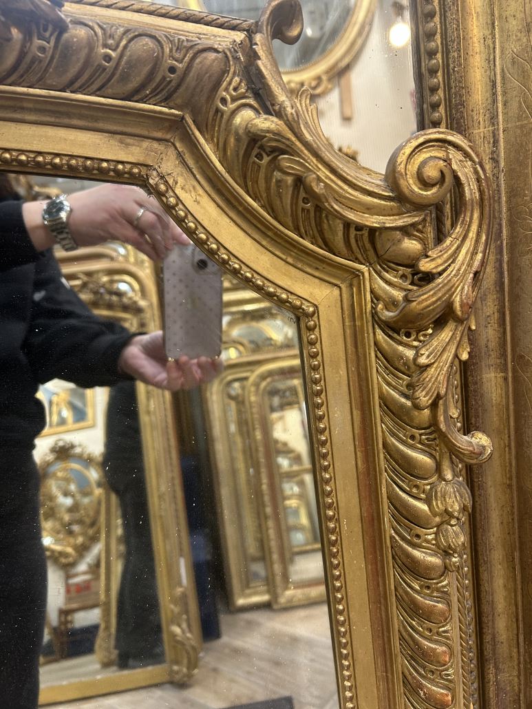Miroir d’époque Napoléon III de style Louis XV (environ 1880) . en bois stuc et feuille d’or. Fronton ajouré et perles. Glace tain à l’argent ancienne.