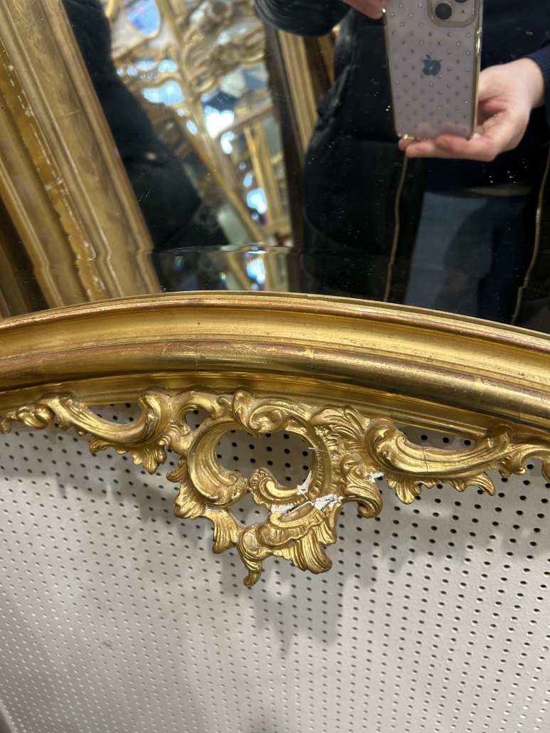 Miroir d’époque Napoléon III de style Louis XV (environ 1880) . en bois stuc et feuille d’or. Fronton ajouré et perles. Glace biseauté tain à l’argent ancienne. Le bas sera réparé.