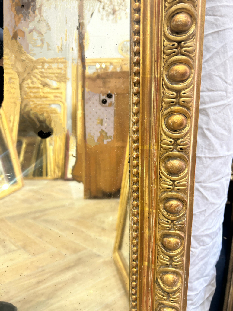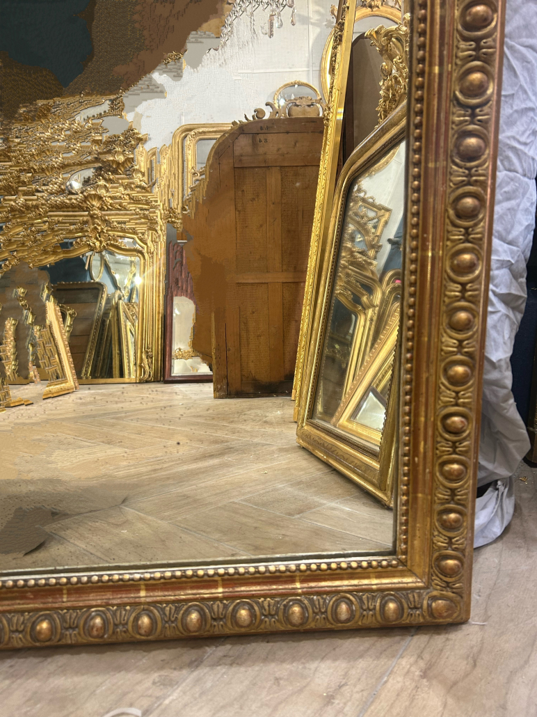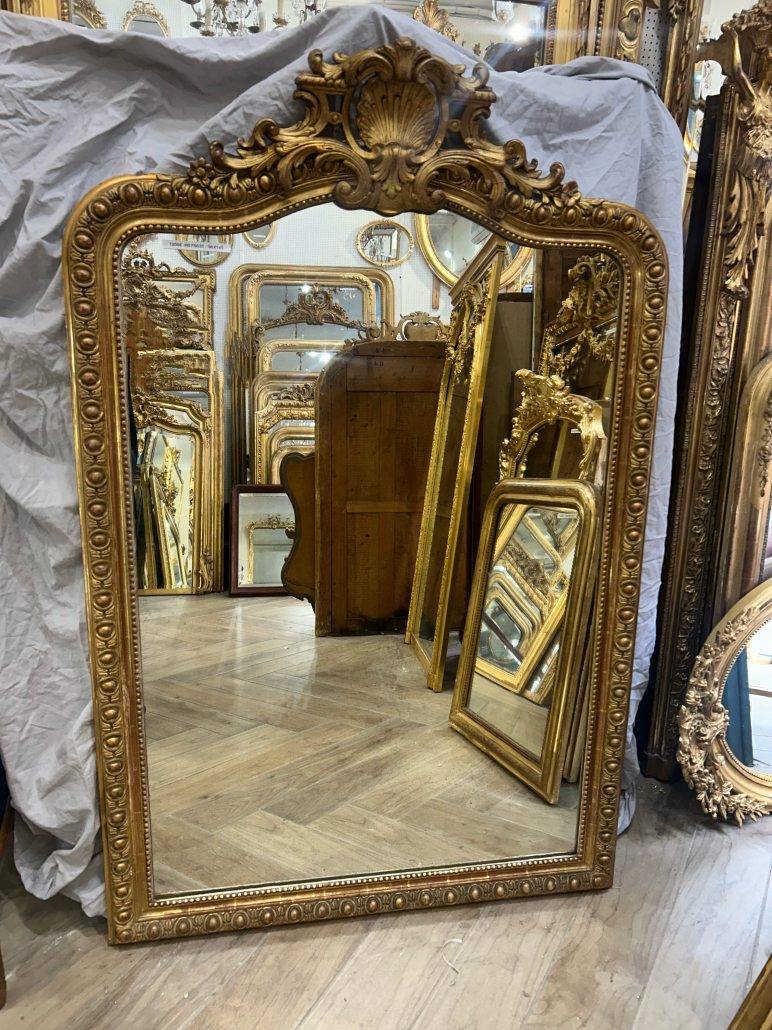 Miroir d’époque Napoléon III de style Louis XV (environ 1880) . en bois stuc et feuille d’or. Fronton ajouré, godrons et perles. Glace tain à l’argent ancienne.