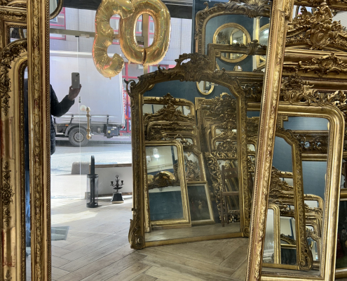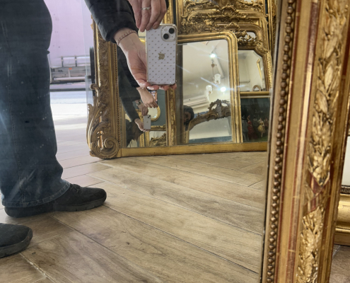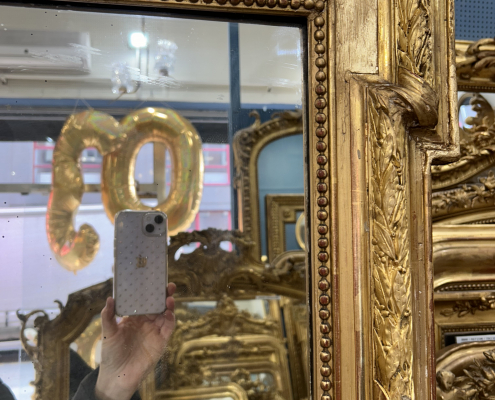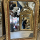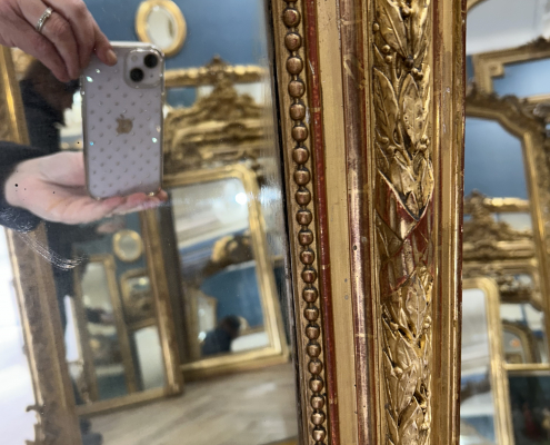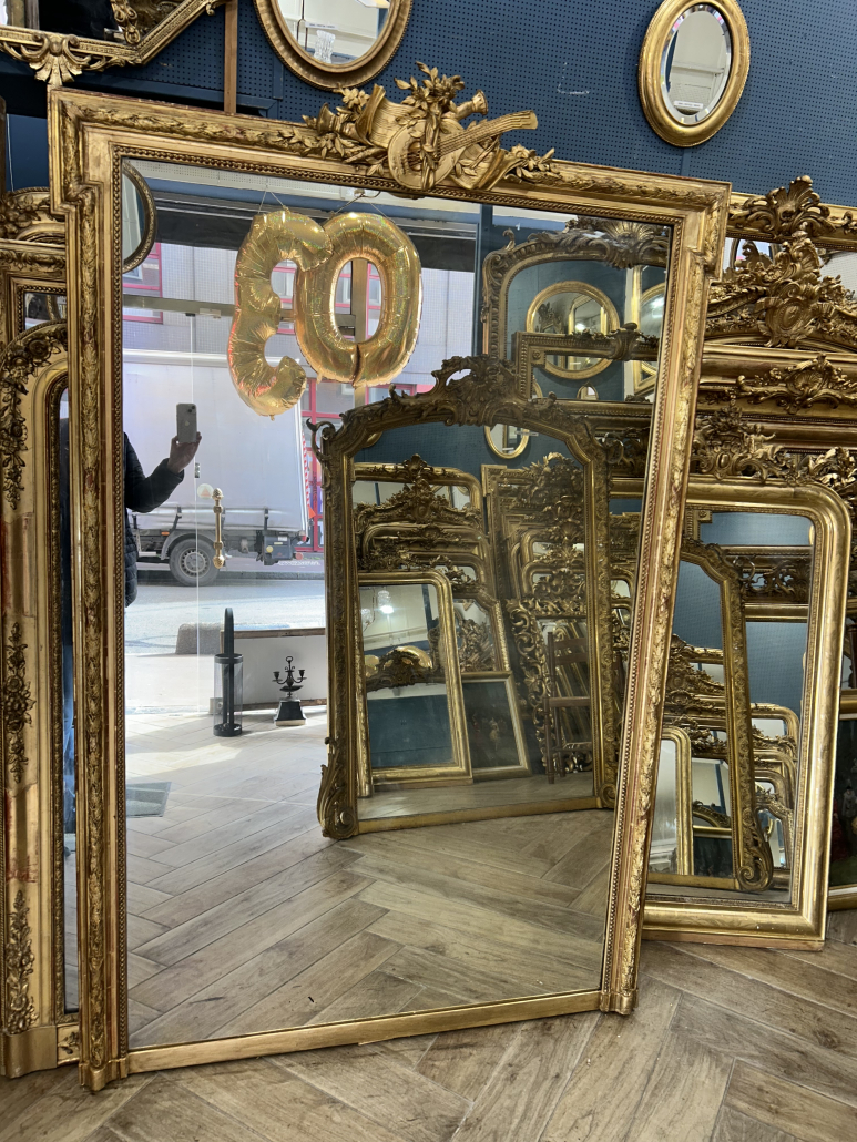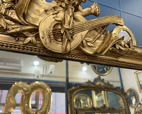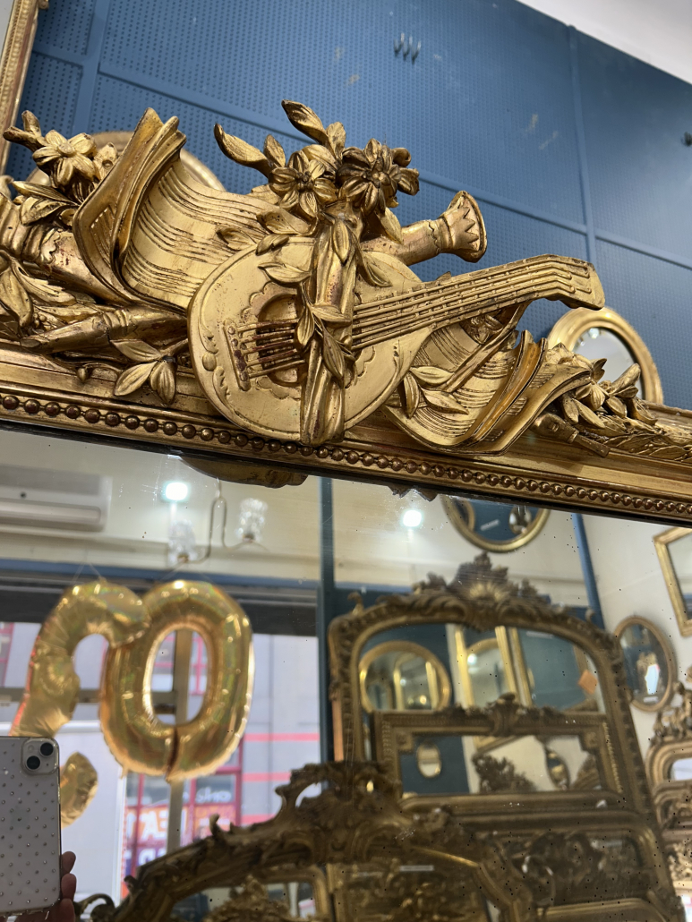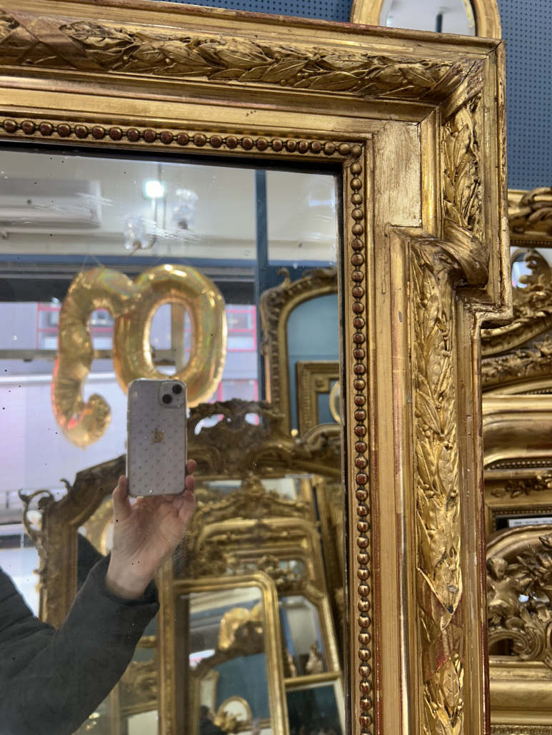 Miroir d’époque Napoléon III de style Louis XVI de cheminée (environ 1880), en bois, stuc et feuille d’or, fronton avec instrument de musique. Glace à l’argent ancienne piqué un peu voilé.