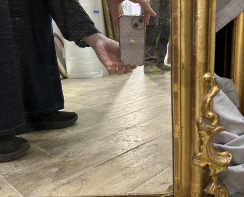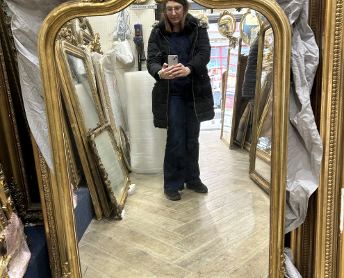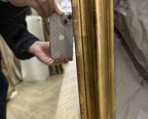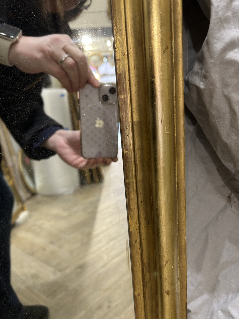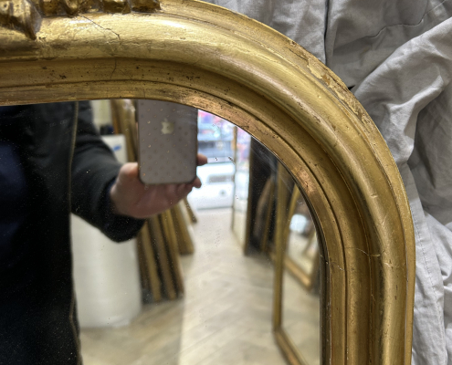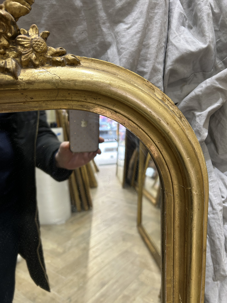 Miroir d’époque Napoléon III de style Louis XVI (environ 1880), en bois, stuc et feuille d’or, fronton Louis XVI. Glace à l’argent ancienne.