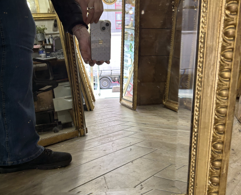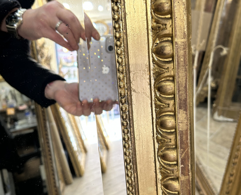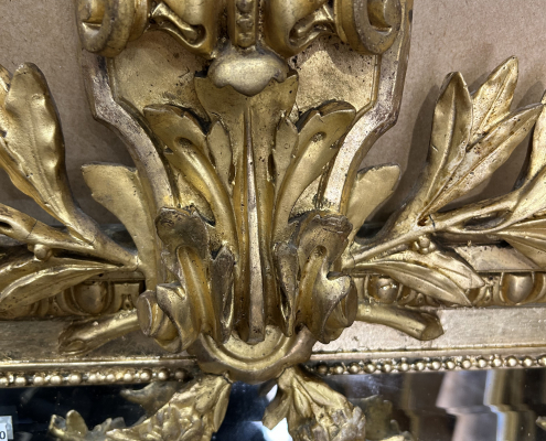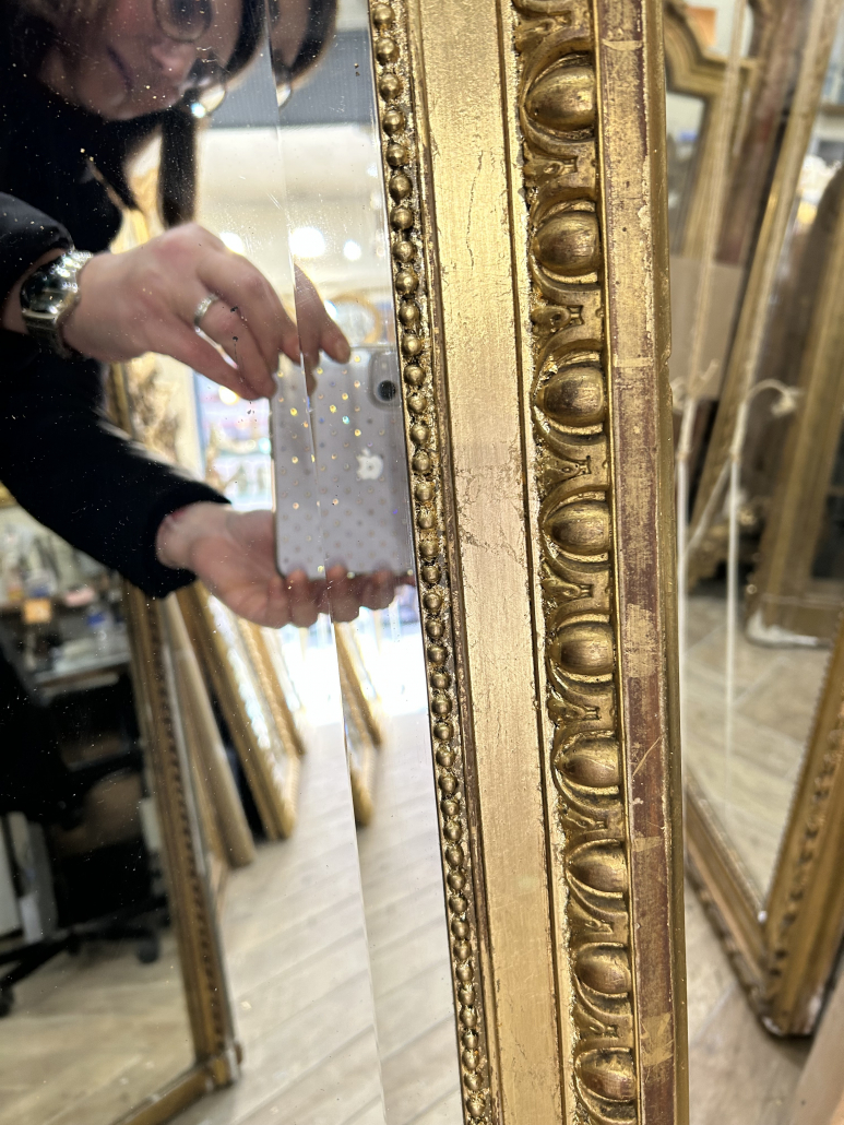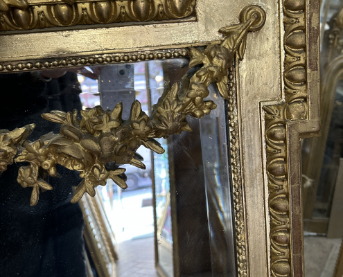 Miroir d’époque Napoléon III de style Louis XVI (environ 1880), en bois, stuc et feuille d’or, fronton Louis XVI, avec guirlandes de fleurs. Glace biseauté à l’argent ancienne.