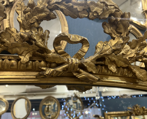 Miroir d’époque Napoléon III de style Louis XVI (environ 1880), en bois, stuc et feuille d’or, fronton Louis XVI. Glace à l’argent ancienne un peu piquée.