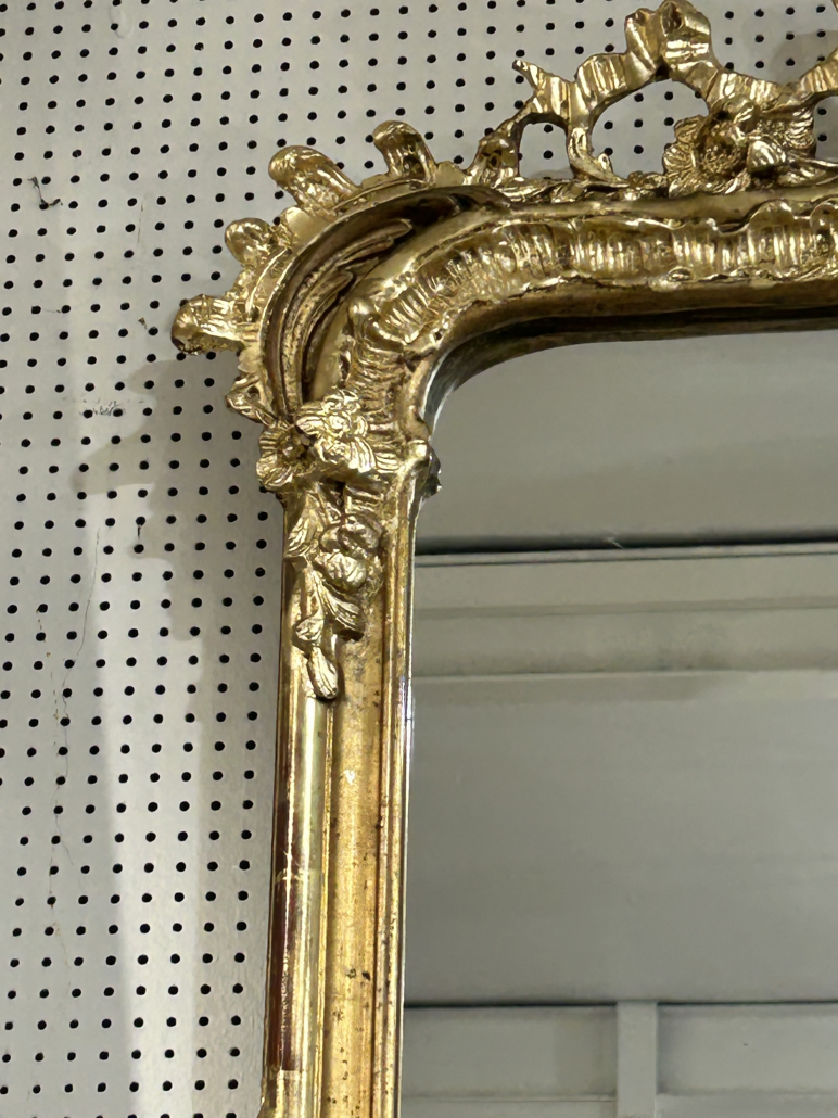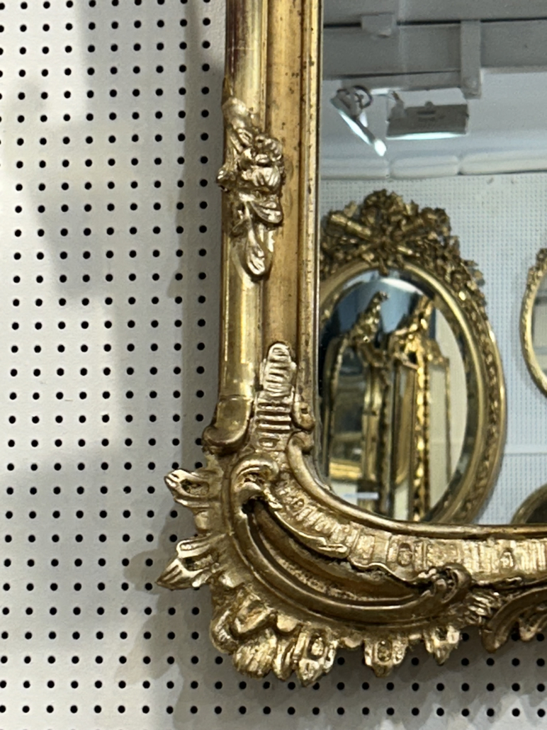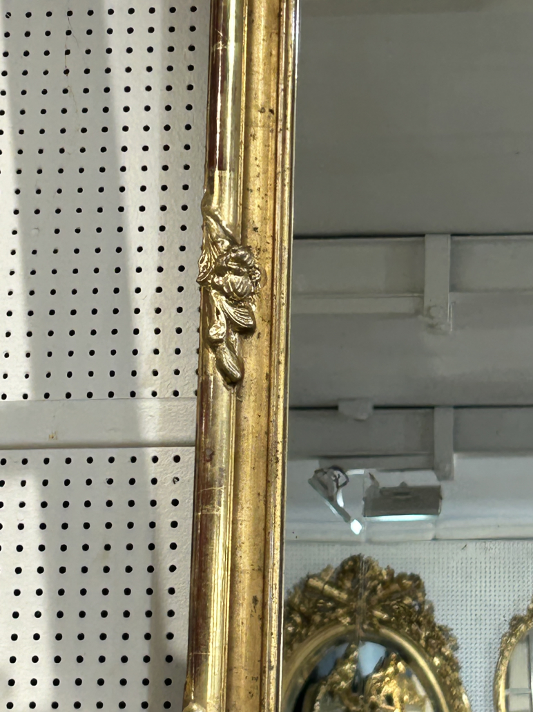 Miroir d’époque Napoléon III de style Louis XVI (environ 1880), en bois, stuc et feuille d’or, fronton Louis XVI. Glace à l’argent ancienne.