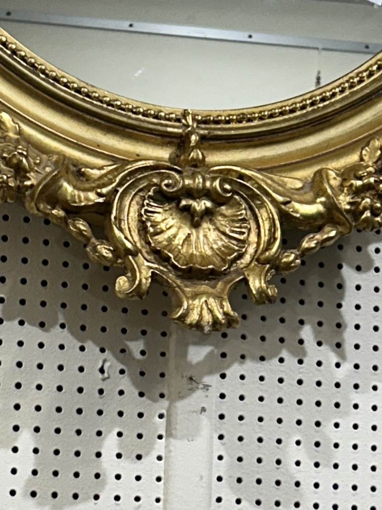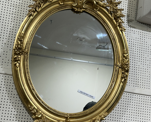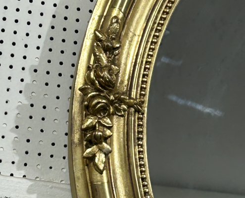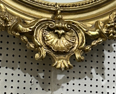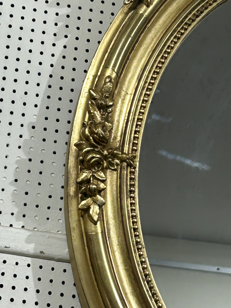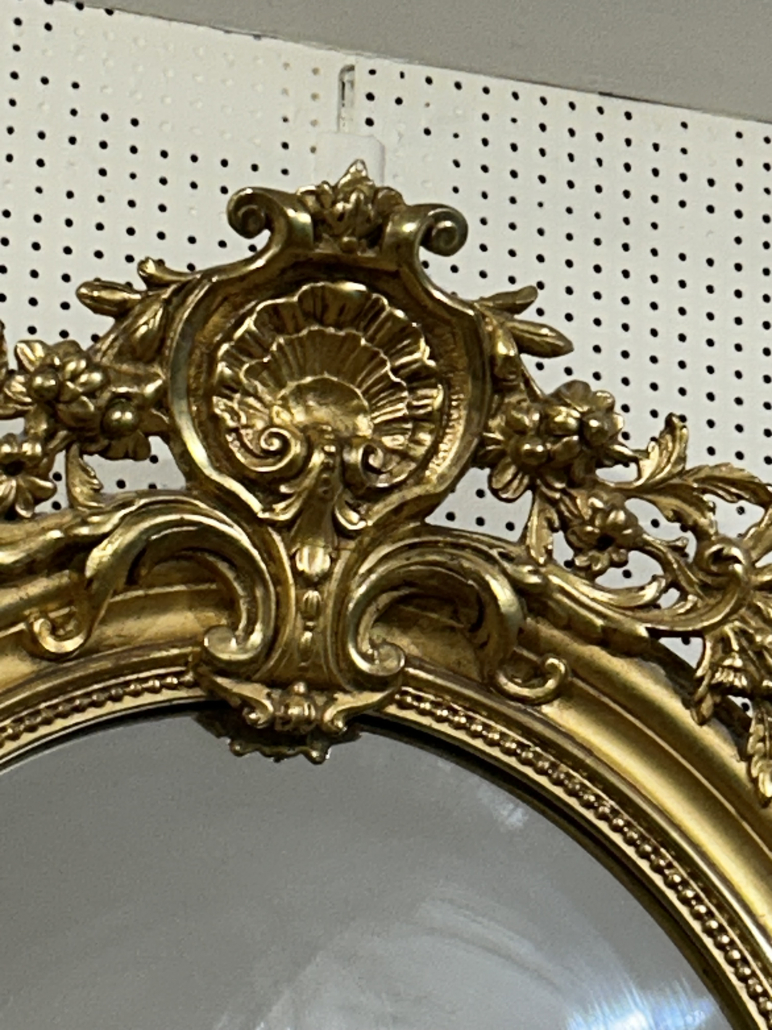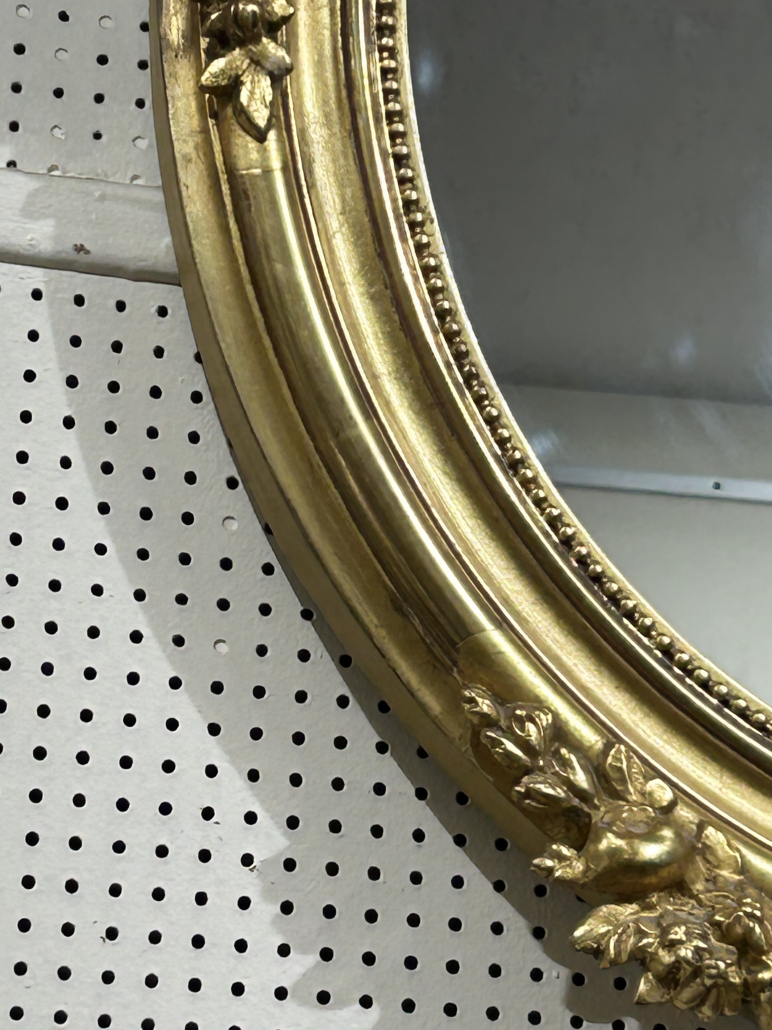 Miroir ovale d’époque Napoléon III de style Louis XV (environ 1880) . en bois stuc et feuille d’or. Fronton ajouré et fleurs. Glace tain à l’argent ancienne.