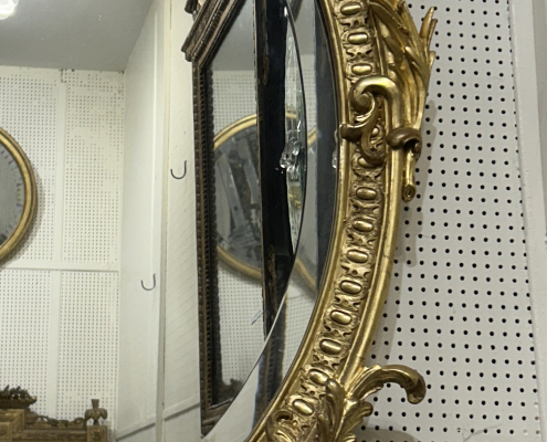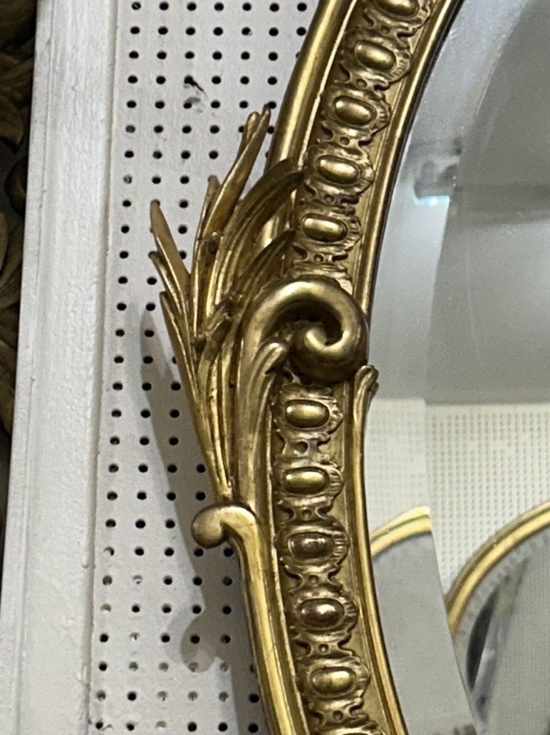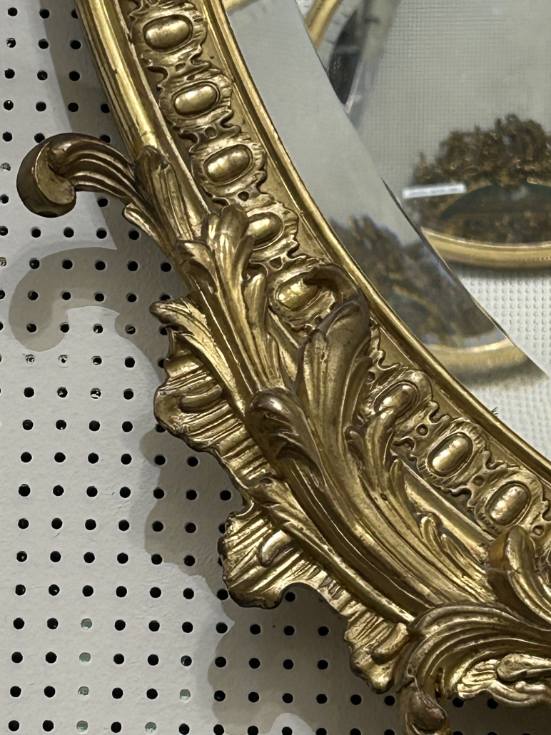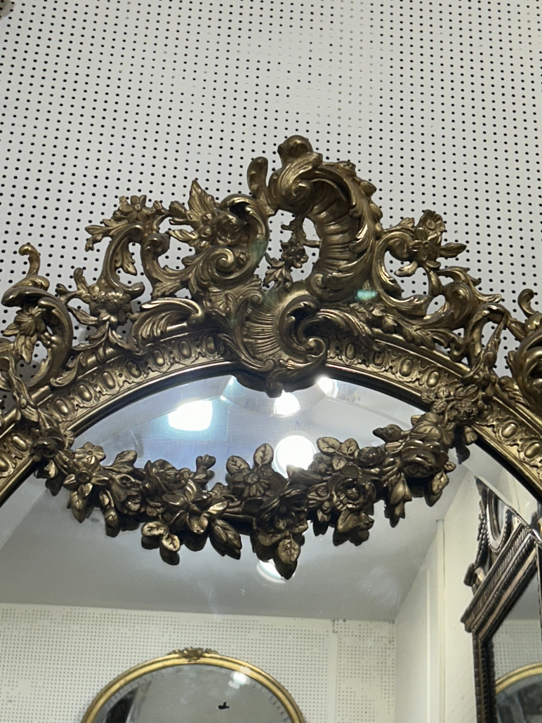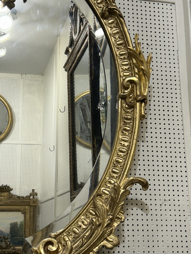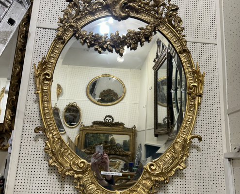 Miroir ovale belle guirlande de fleurs d’époque Napoléon III de style Louis XV (environ 1880) . en bois stuc et feuille d’or fin. Fronton ajouré . Glace biseauté tain à l’argent ancienne.