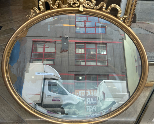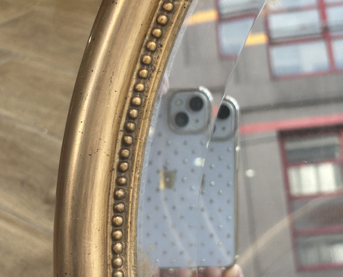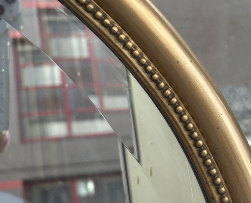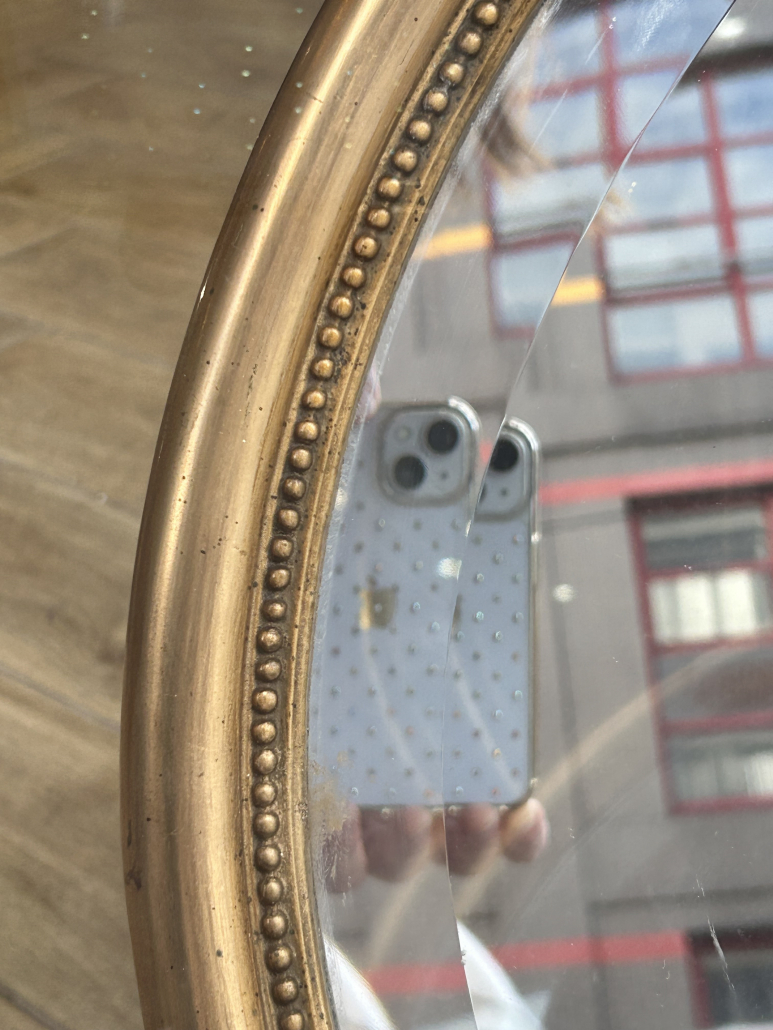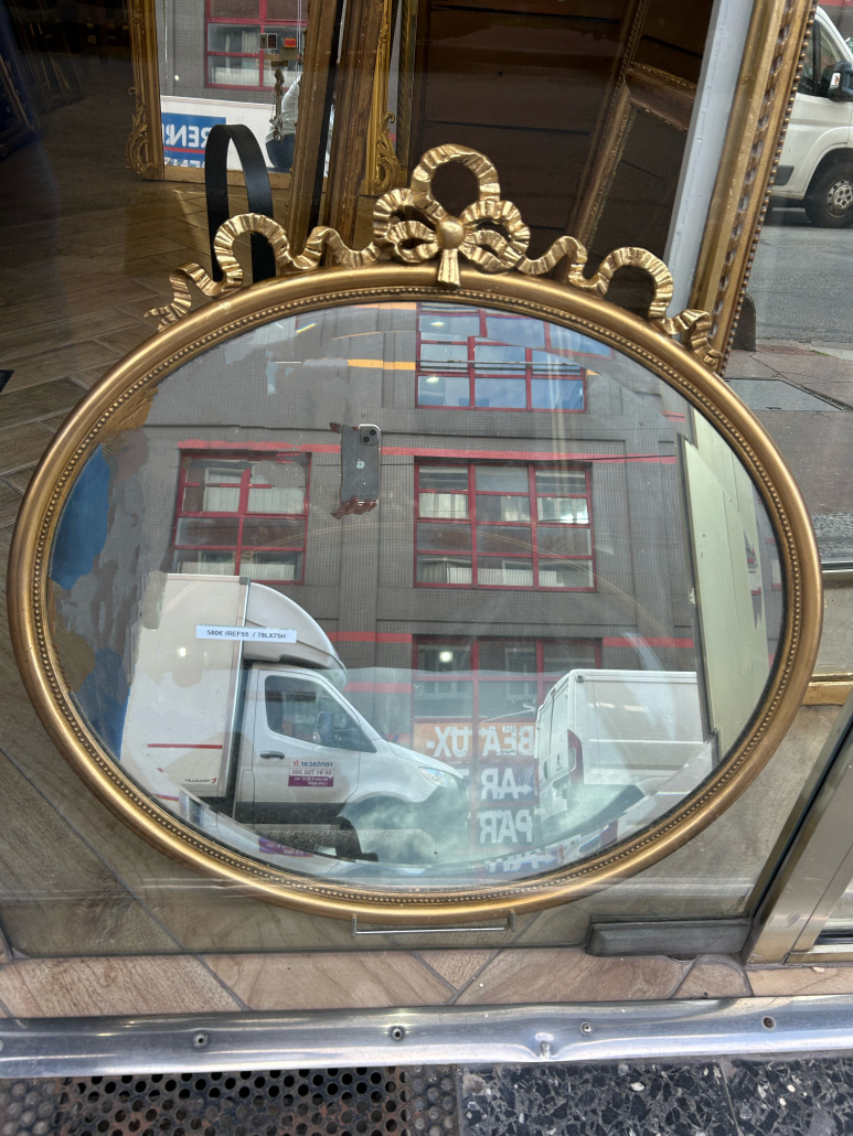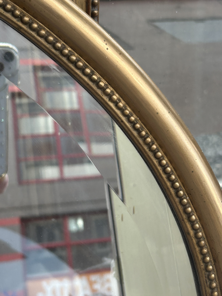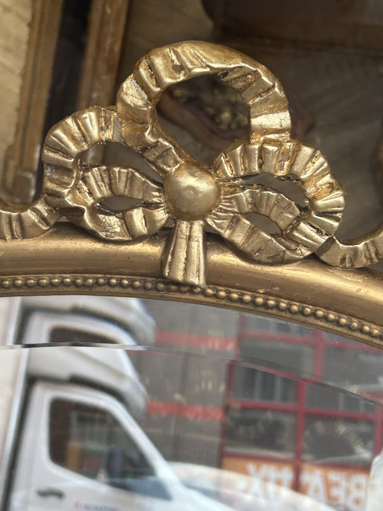 Miroir ovale en largeur d’époque Napoléon III de style Louis XVI (environ 1880), en bois, stuc et feuille d’or, fronton Louis XVI. Glace biseauté à l’argent ancienne.