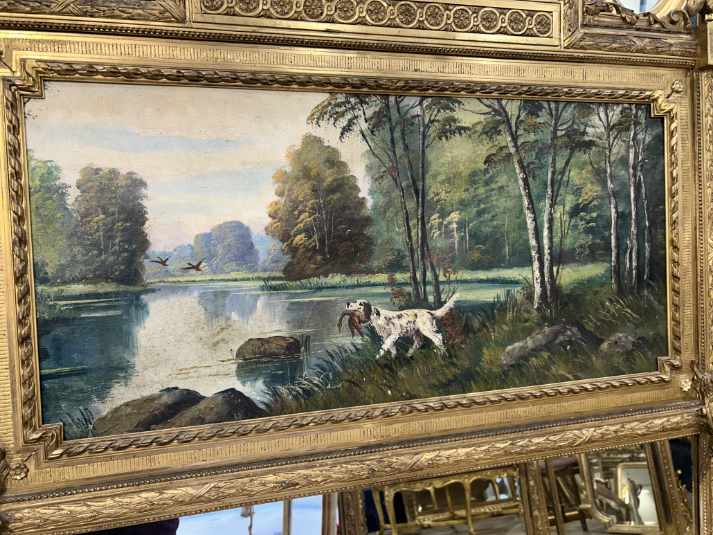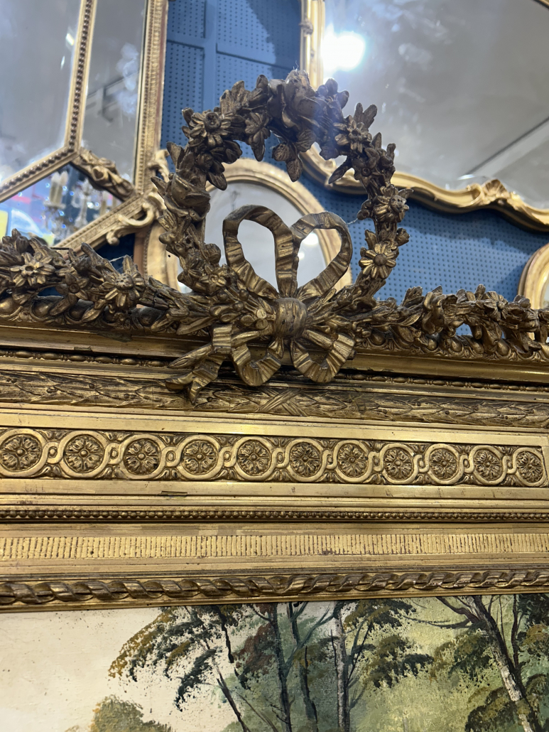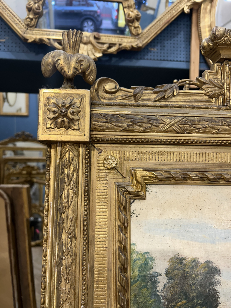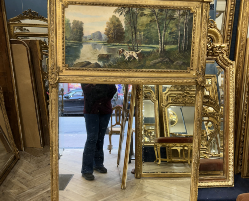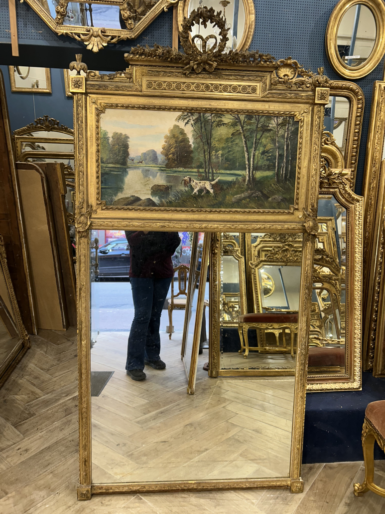 Trumeau d’époque Napoléon III de style Louis XVI, avec une peinture de chasse (environ 1880), en bois, stuc et feuille d’or, fronton Louis XVI. Glace à l’argent ancienne.