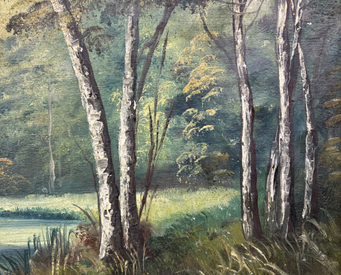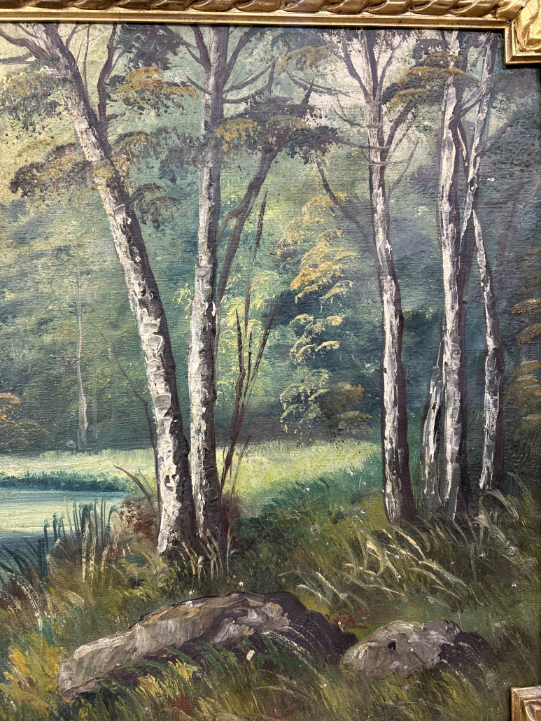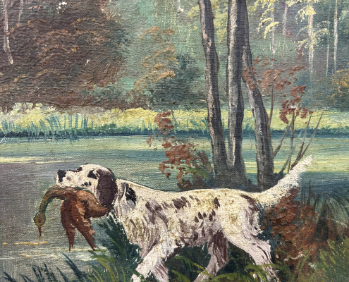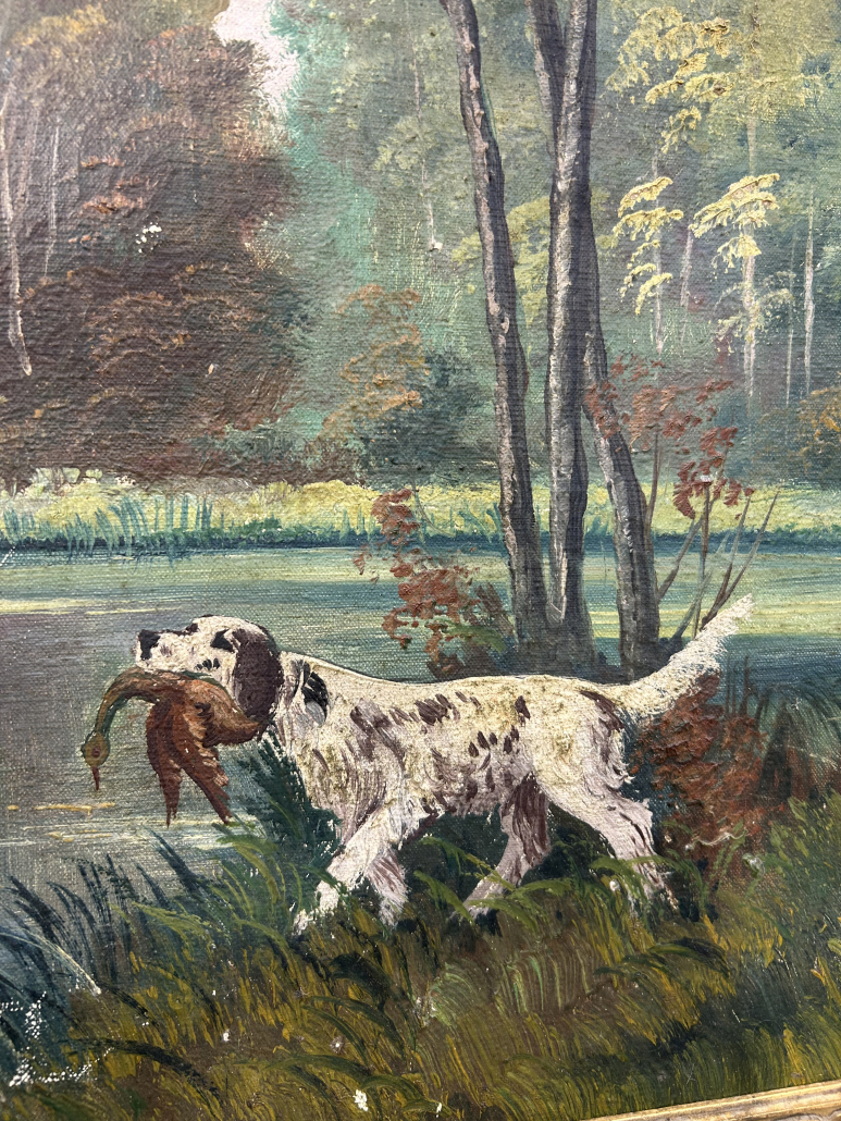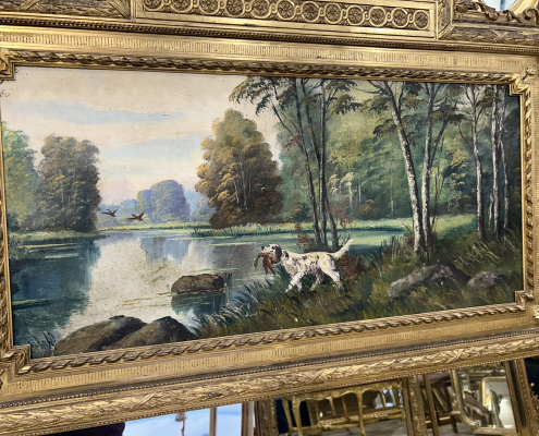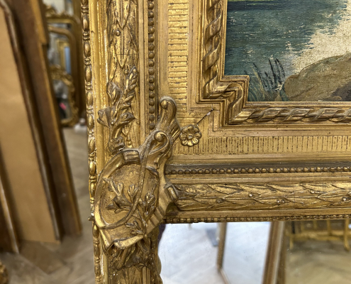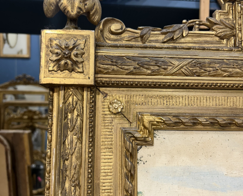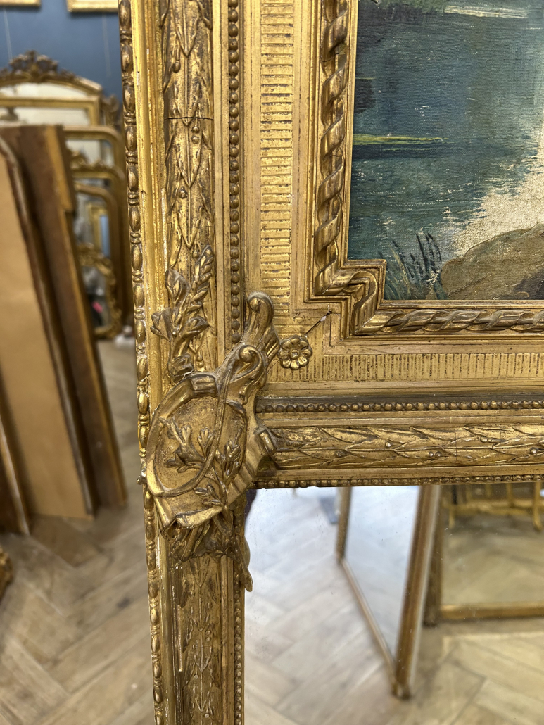 Trumeau d’époque Napoléon III de style Louis XVI, avec une peinture de chasse (environ 1880), en bois, stuc et feuille d’or, fronton Louis XVI. Glace à l’argent ancienne.