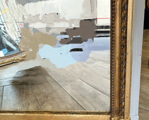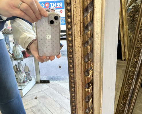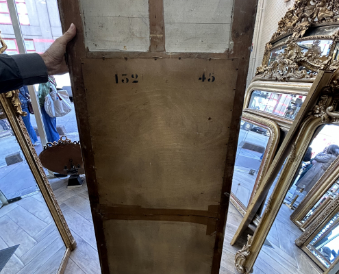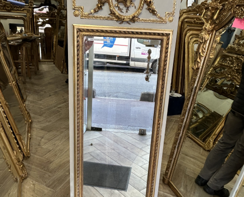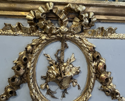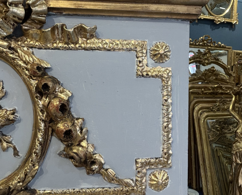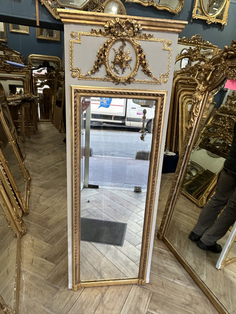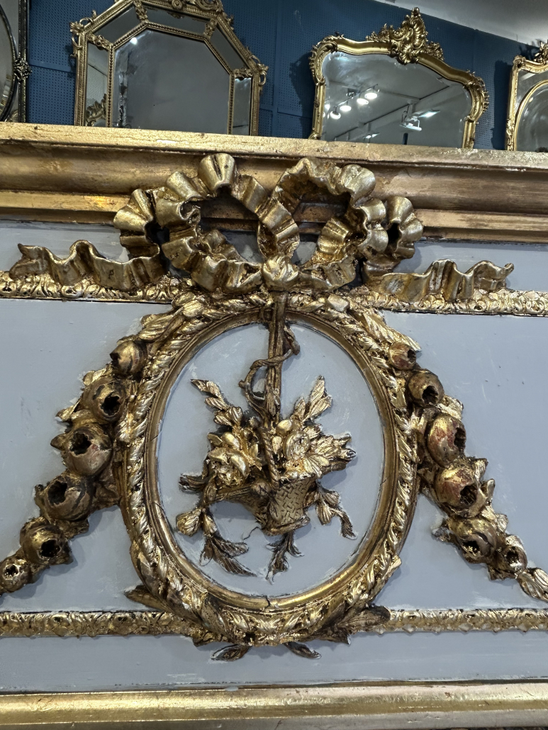 Trumeau d’époque Napoléon III de style Louis XVI de cheminée (environ 1880), en bois, stuc et feuille d’or, fronton Louis XVI guirlande et panier fleuries . Glace à l’argent ancienne.